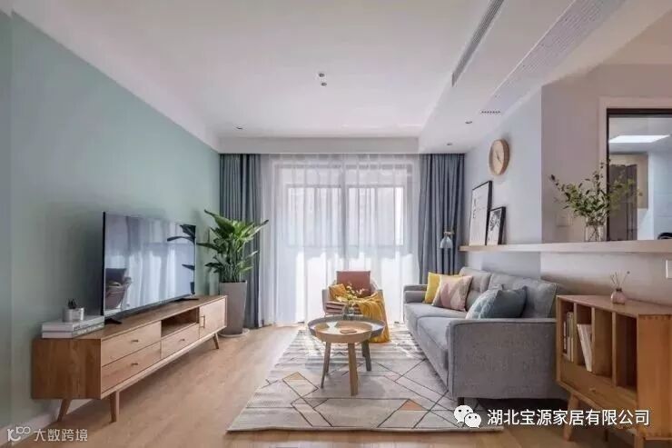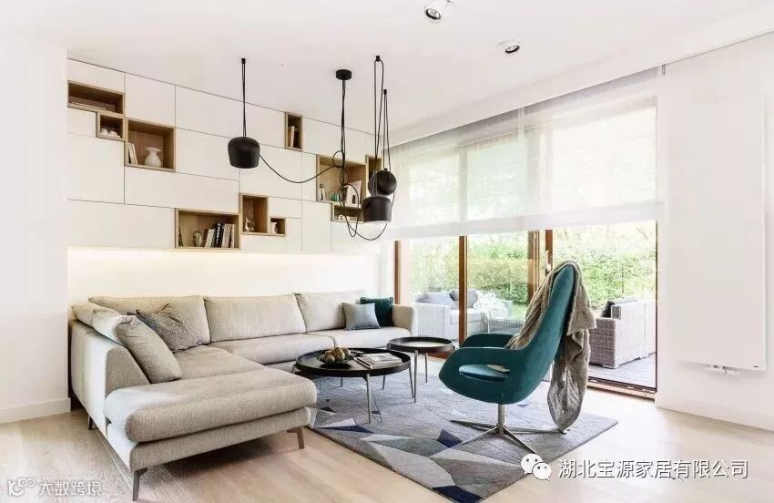 浅色沙发+几何地毯+孔雀蓝单人椅,
