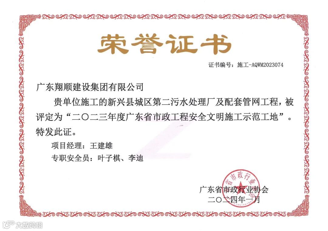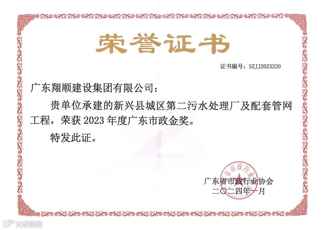 近日,广东省市政行业协会公布了2023年度广东市政金奖名单,由翔顺建设集团承建的“新兴县城区第二污水处理厂及配套管网工程”项目荣获“2023年度广东市政金奖”。广东市政金奖是广东省市政行业的省级最高荣誉奖,体现广东省市政工程质量的一流水平。