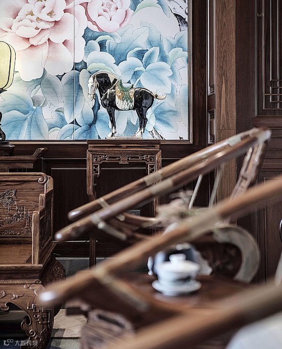 以深色柚木衬托出“花开富贵”的主题,地面订制的泼墨写意花卉地毯,与侧墙工笔花鸟的挂画有层次的对主题进行延伸、渲染;两两相对的明清圈椅造型简练、做工精细。