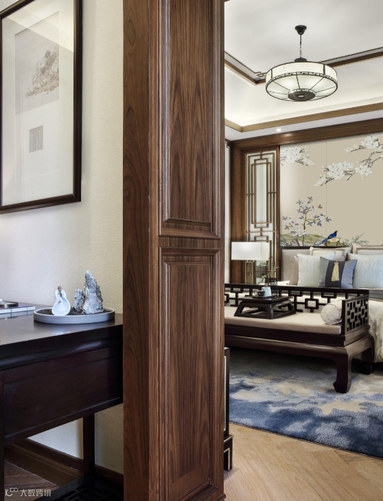 “撷取清风一地香,幽韵清远情飞扬。”中式卧室花鸟背景墙净蕊凝香,一处繁花疏影在时间、空间的流转中洇散着清逸与馨暖,与红木家具相衬,更显红木家具的雅致与古雅
