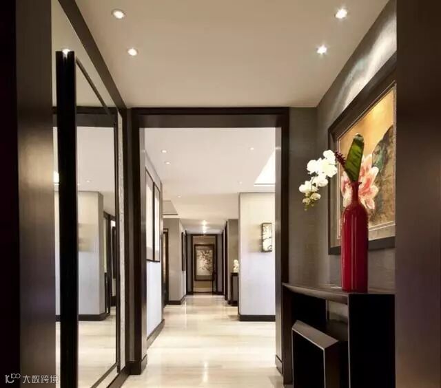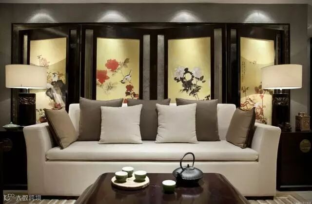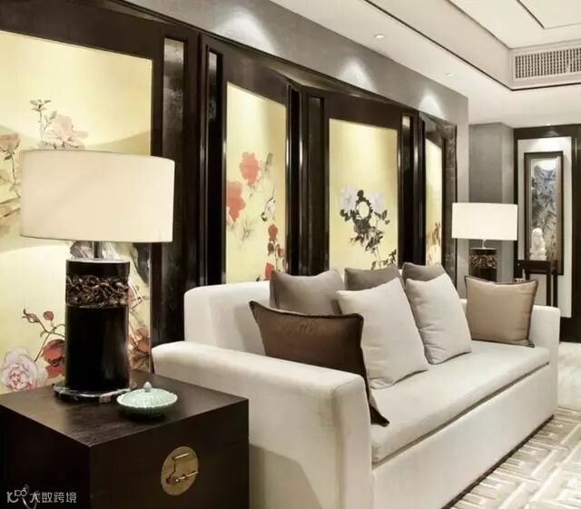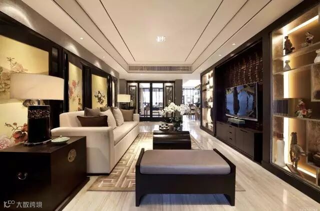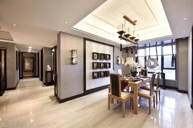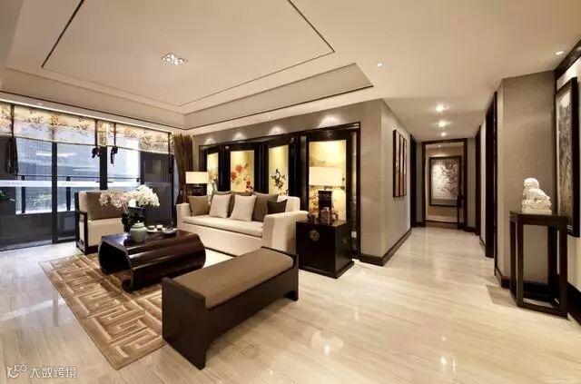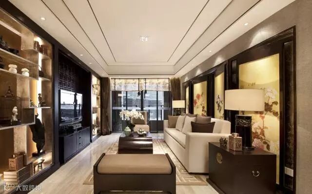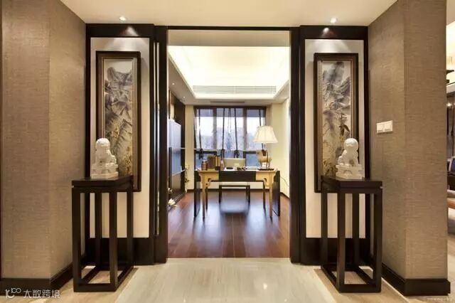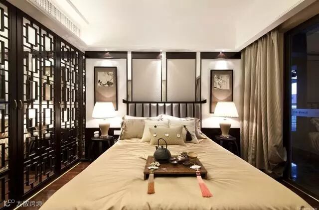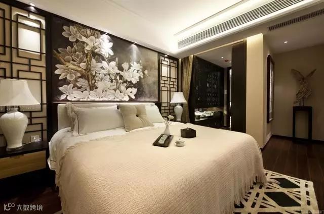 客厅电视背景的中式花格与家具充满东方格调却又不失现代感,中式的窗棂把室外的阳光、树影借到了室内,与山水文案的石材背景相辉映,安静清幽。又使得空间在视觉上得到了延续,扶梯而上,卧室色调清丽淡雅,让家回归休息静心的本质。书房床畔的书桌、兰花,表明了主人的恋恋书香。