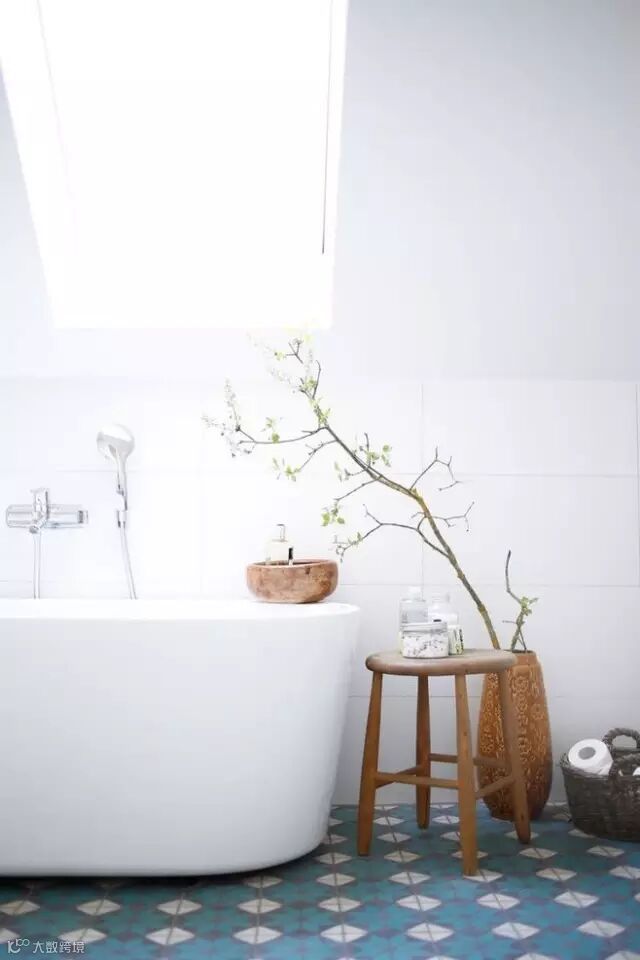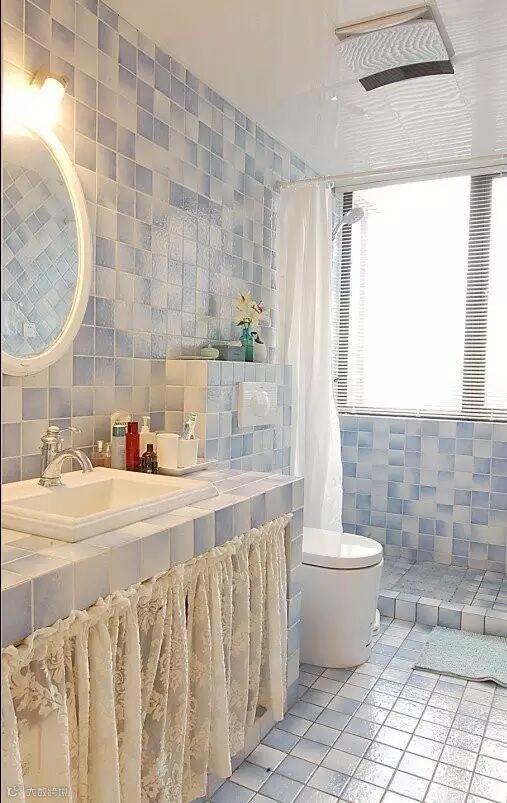 4.小清新的碎花墙纸在洗浴室铺贴哦,呼应蓝色的地砖,100分!
