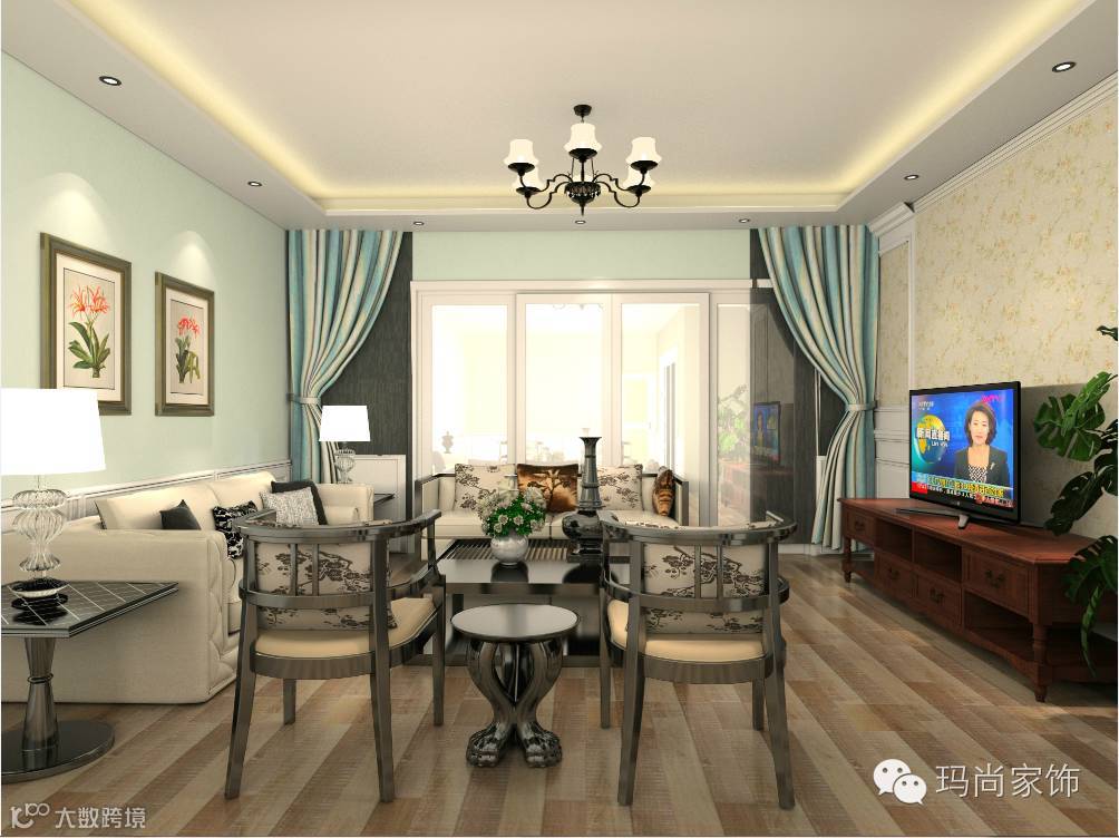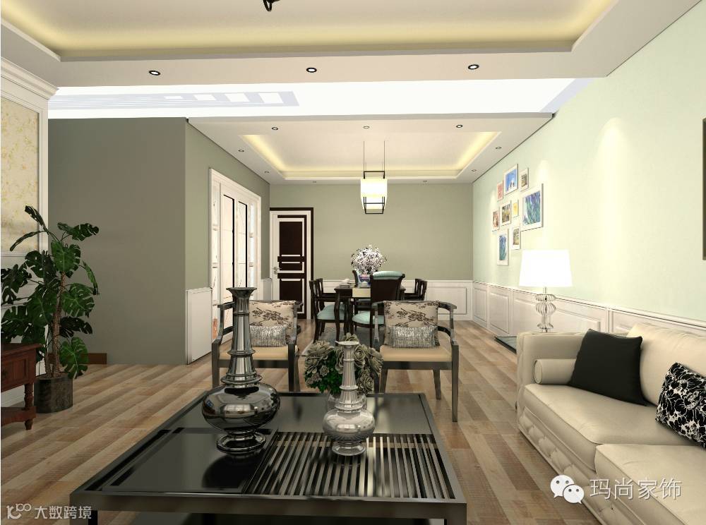 杜美妞喜欢清新自然的颜色,在墙体上,他选择绿色和蓝色的中间色,这个户型餐厅和客厅是相连的,并且下端做了护墙板,中间没有隔断,所以在壁纸上选了同一款,选好款式,利用酷家乐软件先给他出了个效果图。来看下对比。