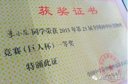 ▲小龙在2015年获得全国初中物理竞赛一等奖