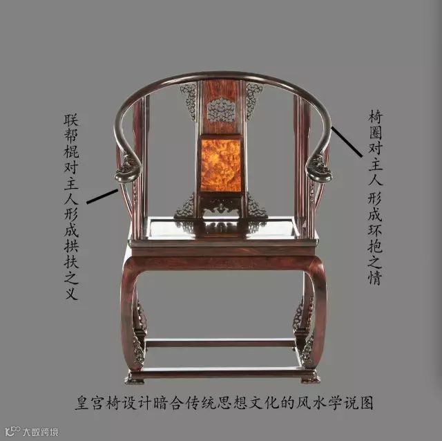 皇宫椅,法效天地之形而制,椅圈为圆,象征天,取意天圆;坐板为方,象征地,取意地方,人端坐在中间,达到《中庸》中所说“致中和,天地位焉,成物育焉”、“与天地焉”的“天地人三才合一”之境界。人从容于天地之间,尽显主人的“内圣外王”的非凡气度。