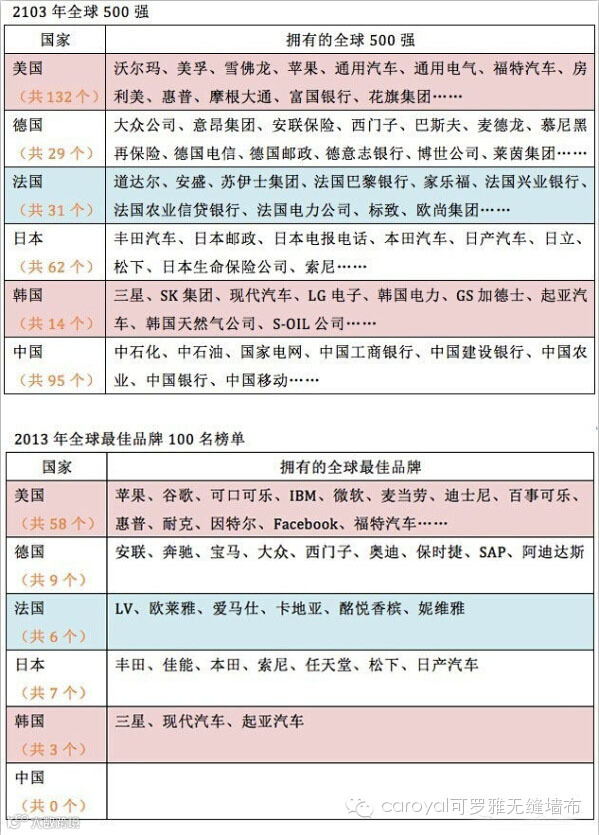 上图分别为“2013年全球500强”和“2013年全球最佳品牌100名”榜单,其中“全球500强”名单,中国企业有95家名列其中。但在“全球最佳品牌100强”名单中,却没有一家中国企业!要知道,前者仅仅只是企业规模的排行榜,后者才是反映企业的国际知名度和竞争力。