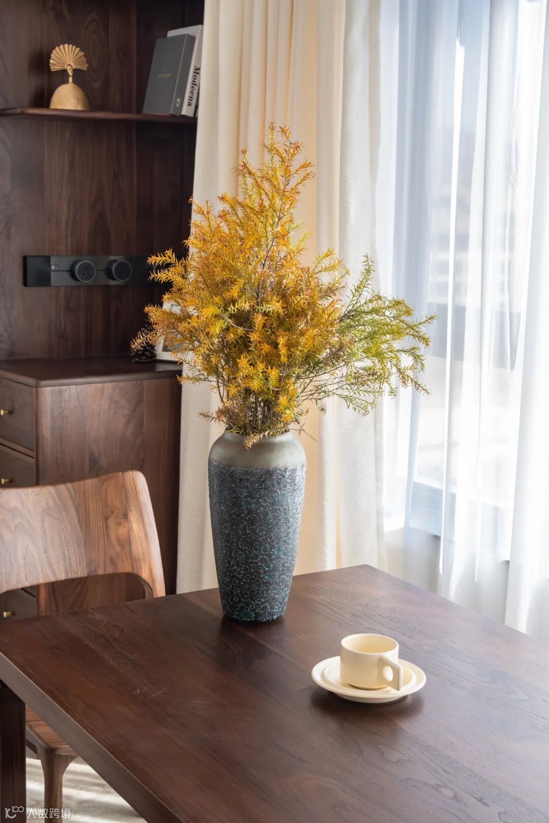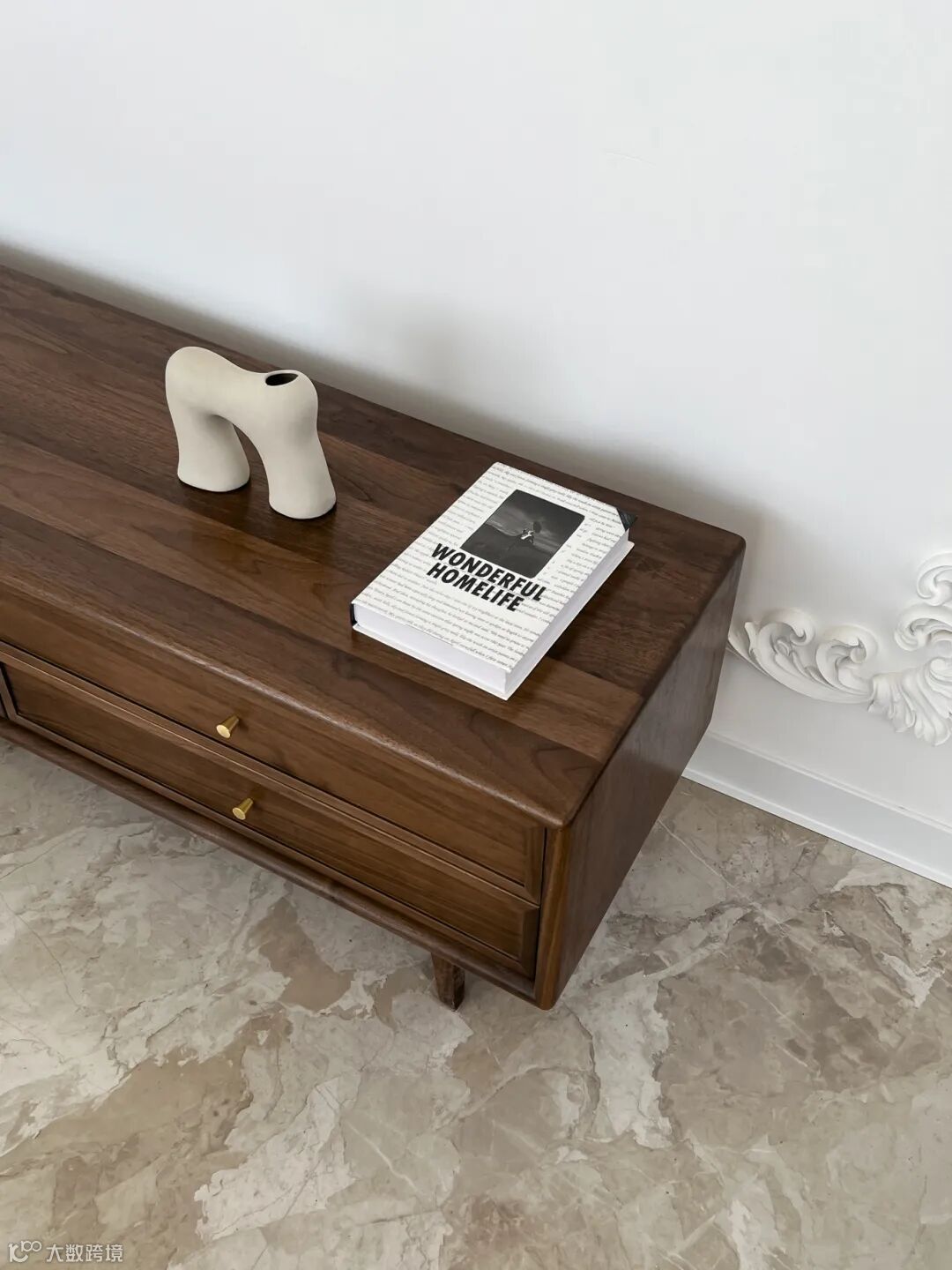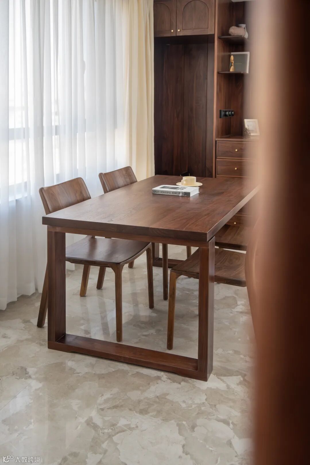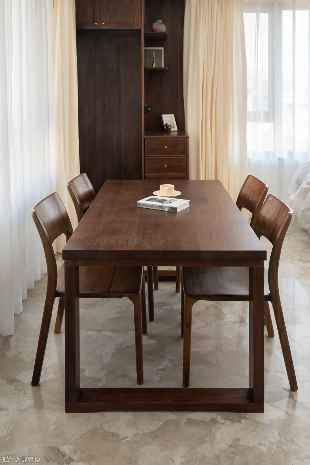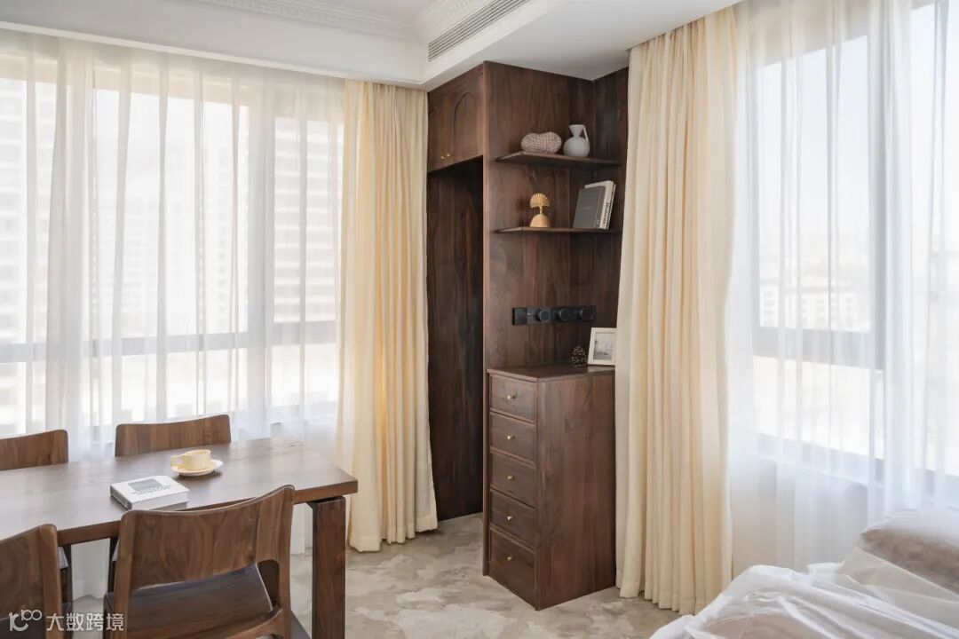 白色的墙面与黑胡桃的原木家具形成对比,
