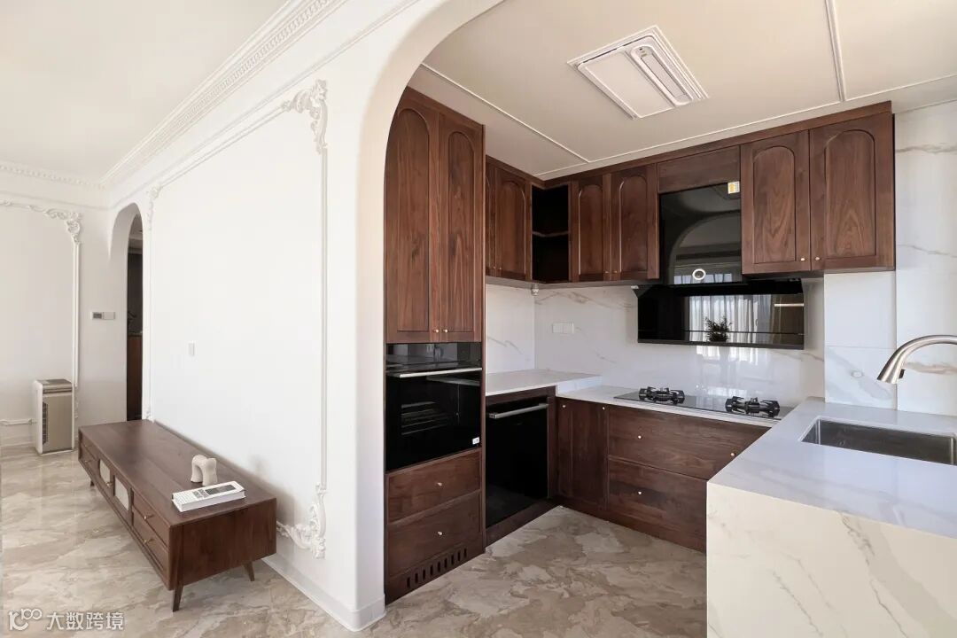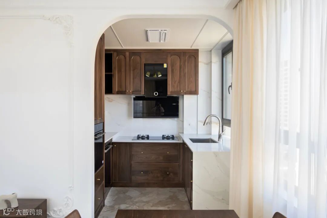 厨房与客餐厅也通过拱形门连接,