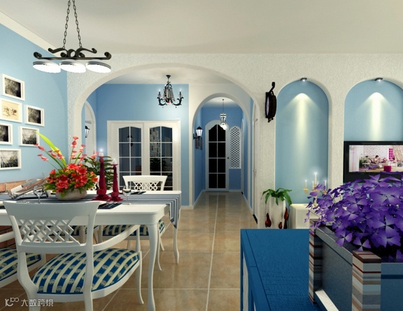 浅色系的撞色,碰撞出田园小资的风情。浪漫的蓝,清新的绿,瞬间点亮你的客厅~