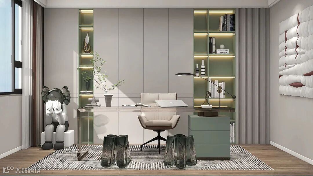 以简约静谧为主调的书房,绿色的些微缀入清新舒适,不失柔雅的书香气质萦绕。为室内赋予轻松格调。