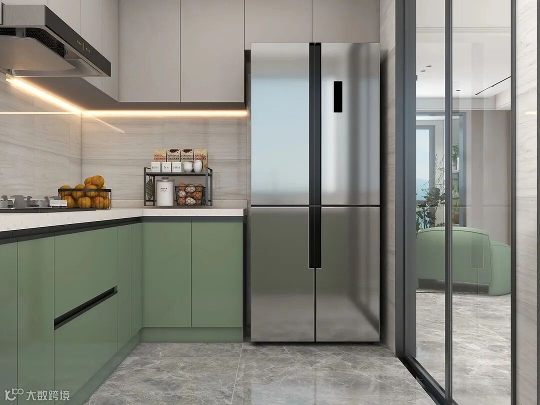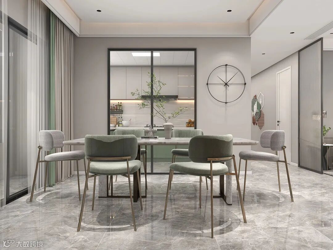 空间中的绿色蔓延至厨房,在颜色的配比上,共同塑造出空间层次感。一扇透明玻璃推拉门,让厨房与客餐厅的间隔似有似无,让视觉更加通透。