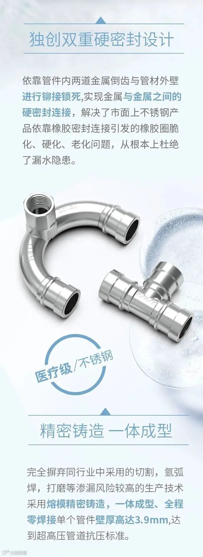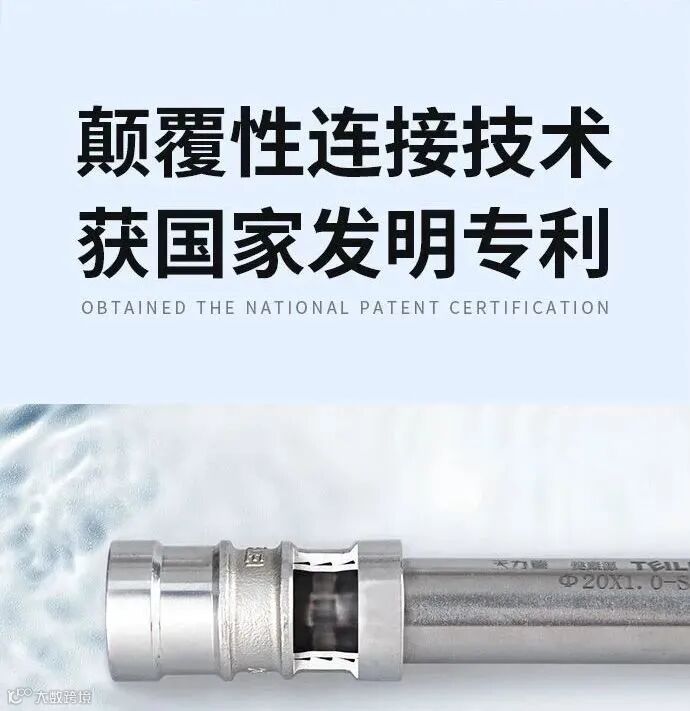 不锈钢管件壁厚高达3.9mm,强度更高,独创硬密封连接技术,能抗700kg拉拔力,极限承压超过10MPa,超国标规定的2.5MPa。