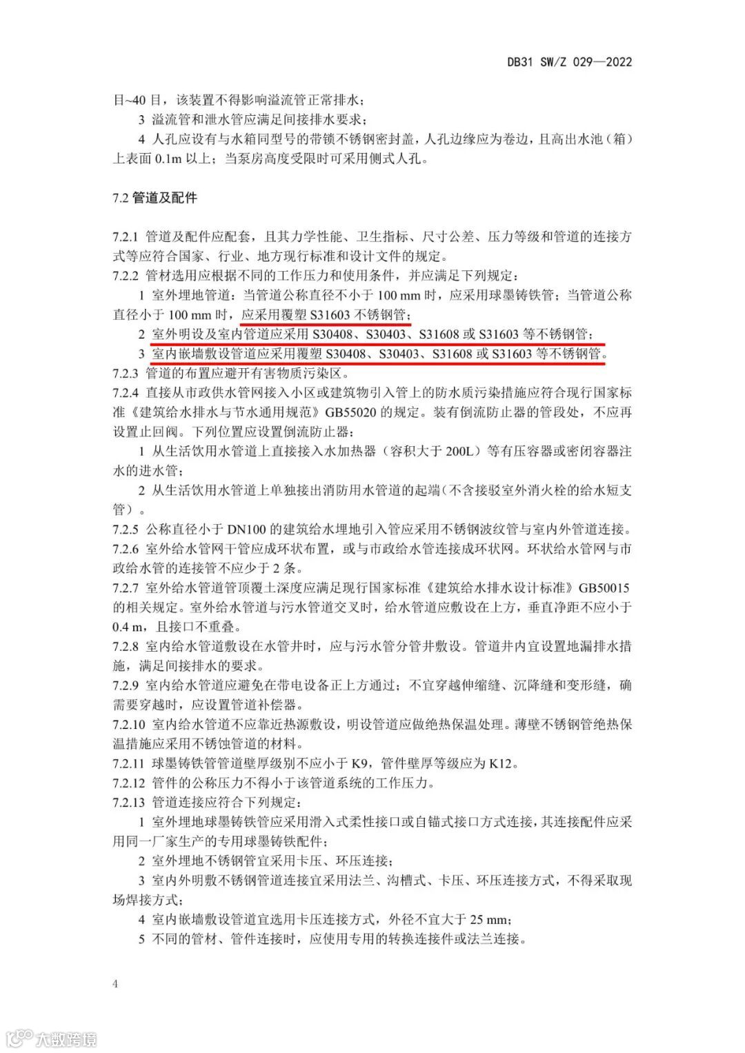 室外明设及室内管道应采用S30408、S30403、S31608 或 S31603 等不锈钢管;