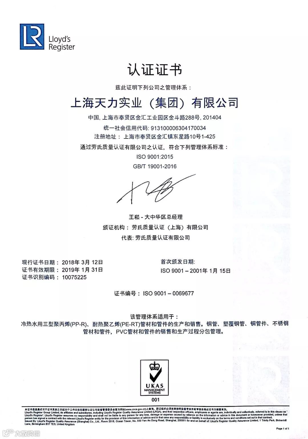 2001年,在新世纪的伊始,天力首次通过英国劳氏ISO9001质量体系认证。