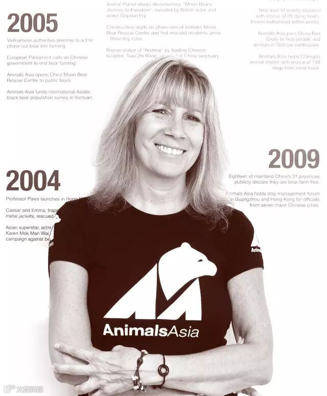 She established 2 bear rescue centers in Longqiao of Sichuan Province and Vietnam, both of which won the ‘Carole Noon Award’ for Sanctuary Excellence by the Global Federation of Animal Sanctuaries in 2010