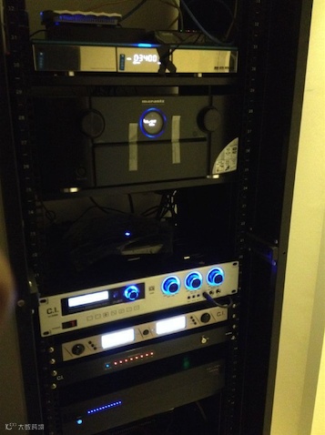 4响器材如功放、DVD机等播放设备叠放在柜子中