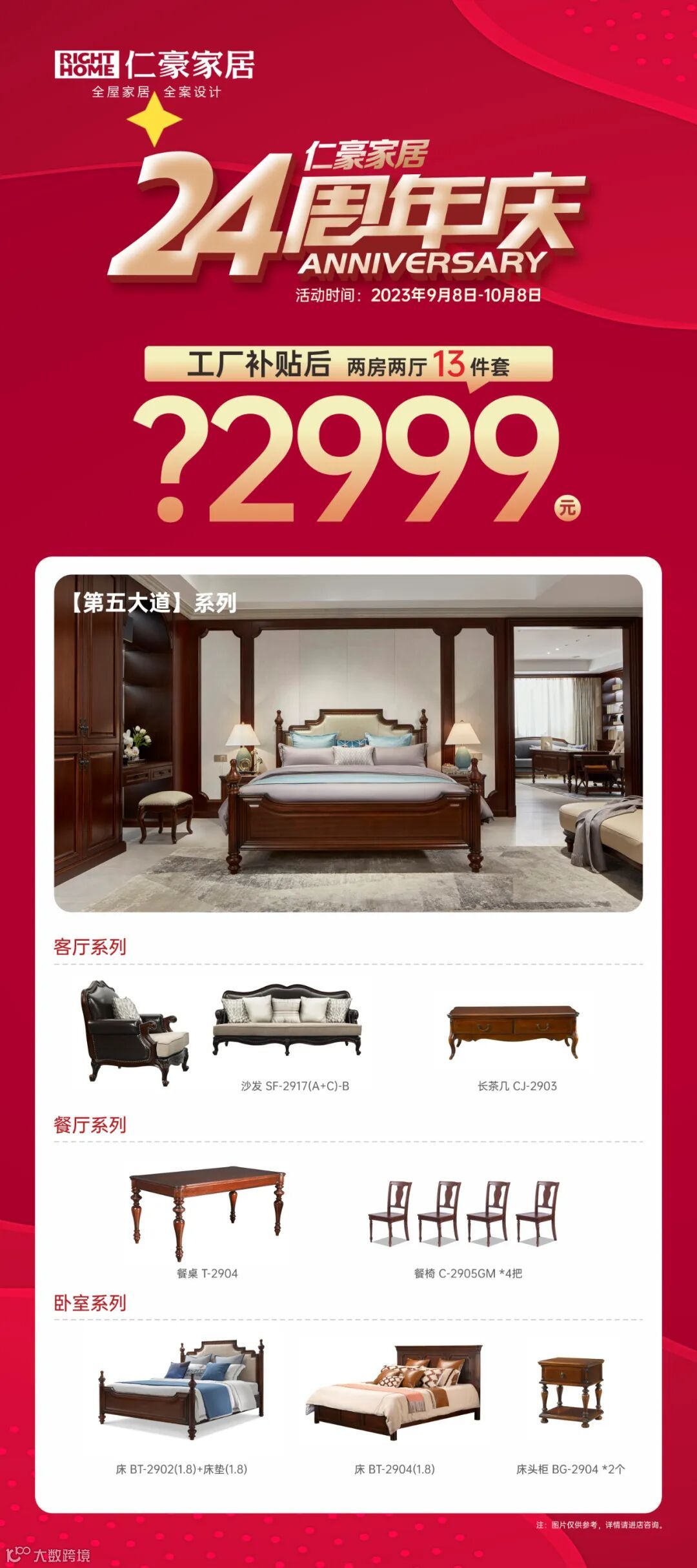 仁豪家居24周年庆,为感谢消费者对于我们的支持,官方补贴千万,特别推出第五大道全屋两房两厅13件套套餐,使消费者在全屋全案中可以享受透明的价格和轻松的方式,满足了大众高性价比的一站式全屋整装家居需求。