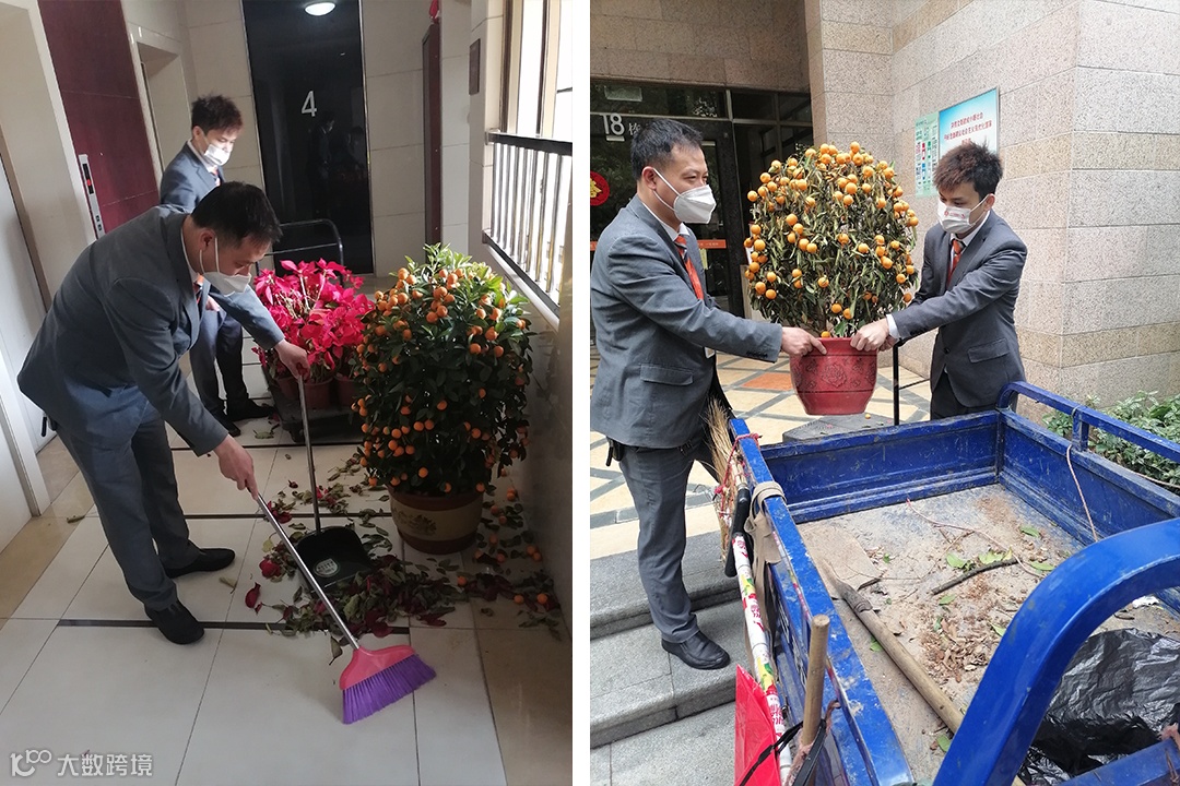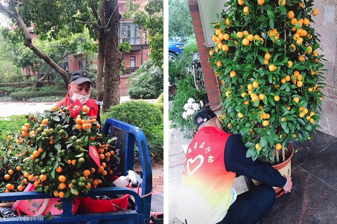 物业工作人员上门将年桔年花搬运