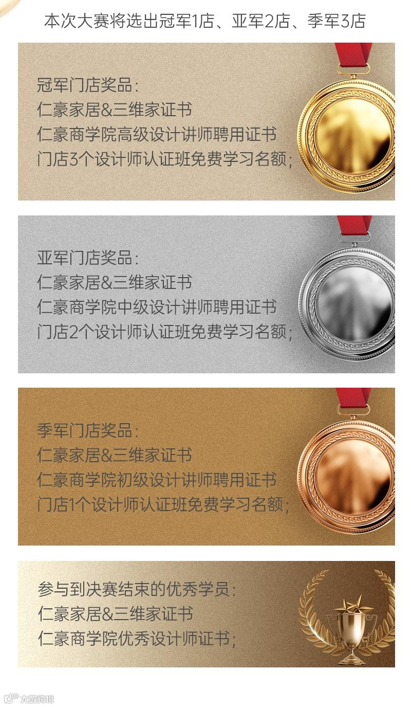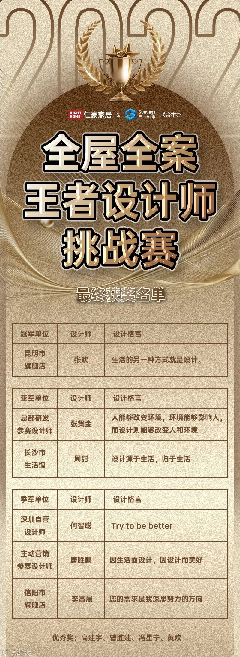 全屋全案王者设计师挑战赛,分别设置三大奖项:冠军1店、亚军2店、季军3店。
