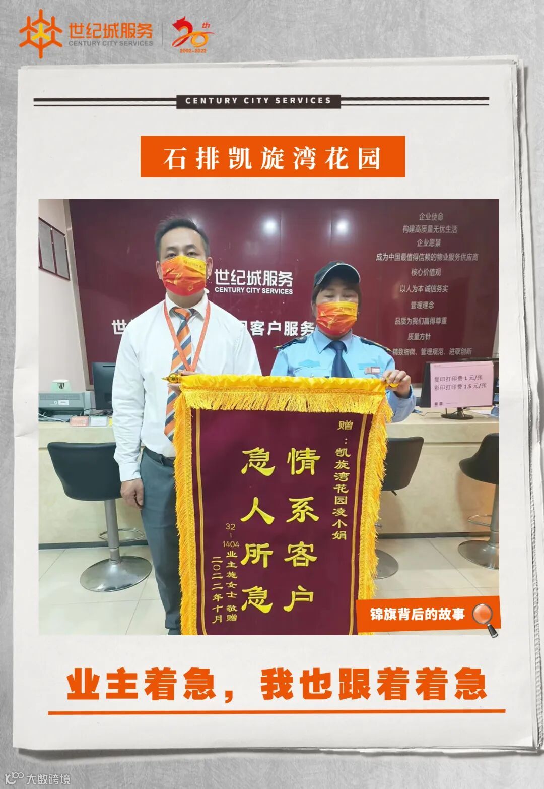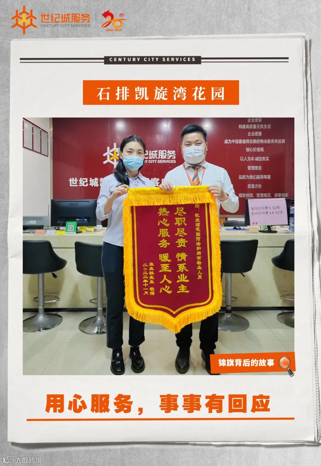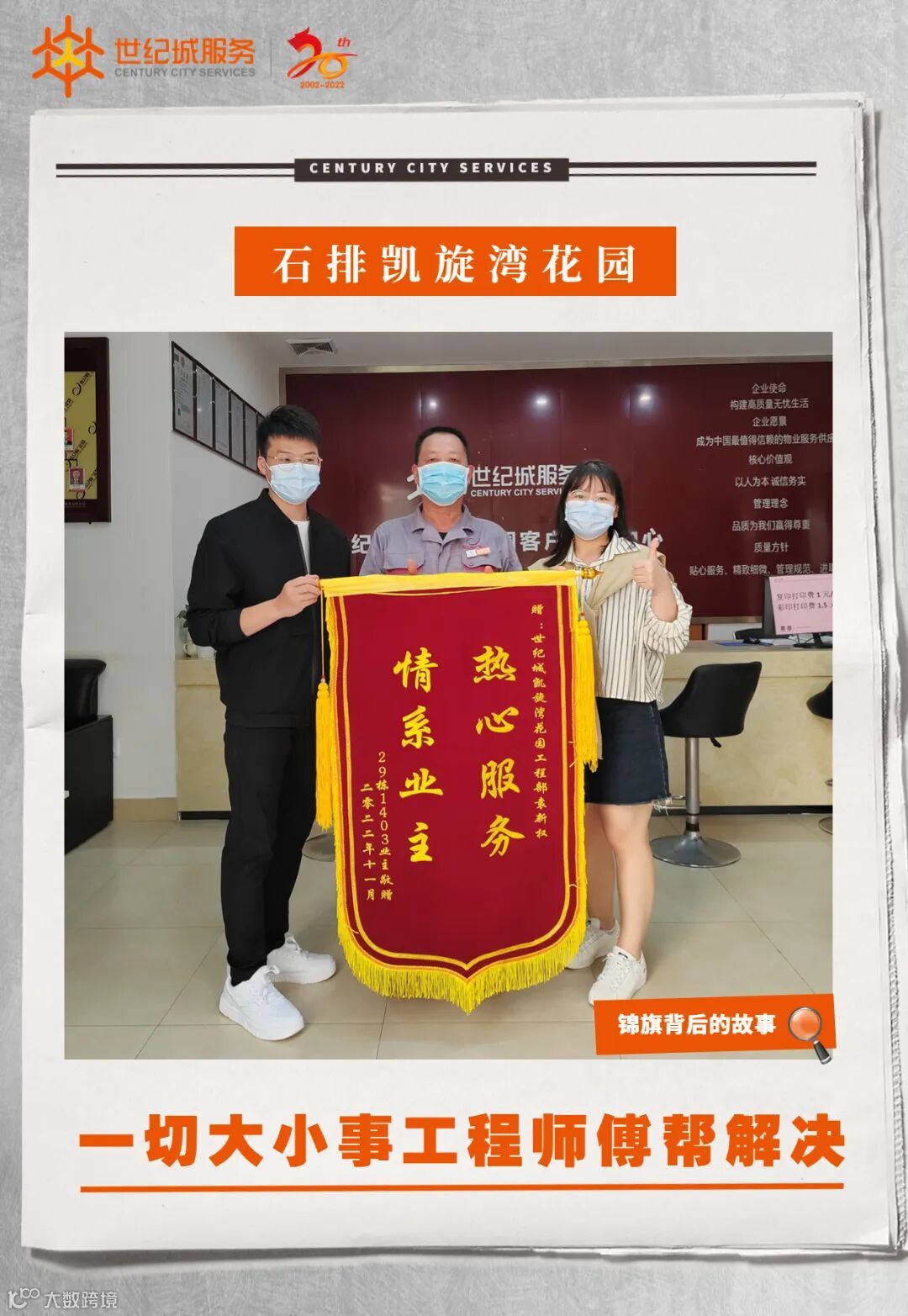 11月21日下午17:30分,石排凯旋湾花园服务处收到29栋301业主送来一面写有“尽职尽责情系业主,热心服务暖至人心”的锦旗,感谢客服部何浩同志工作认真负责、解业主所急的贴心服务。