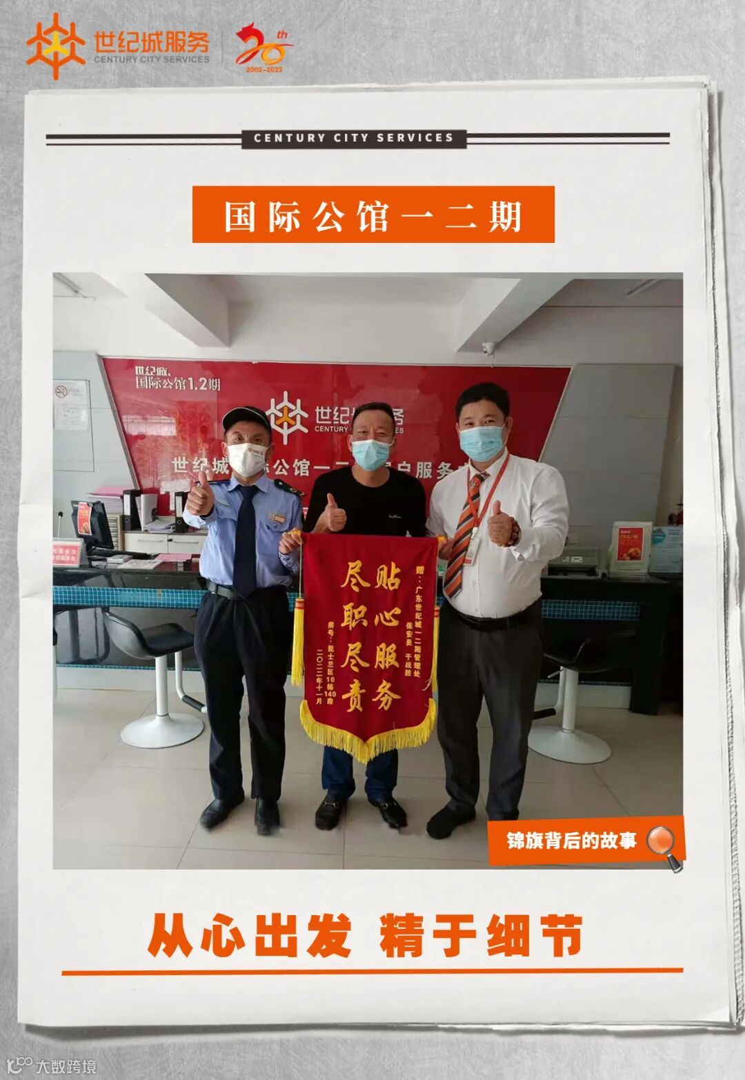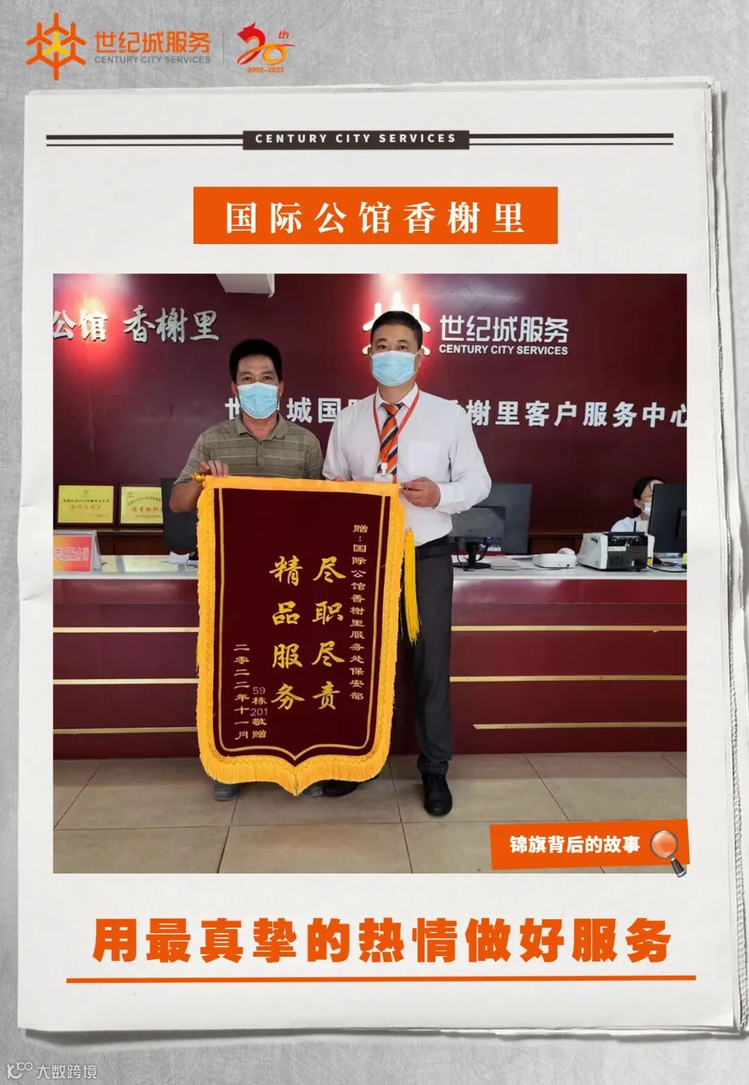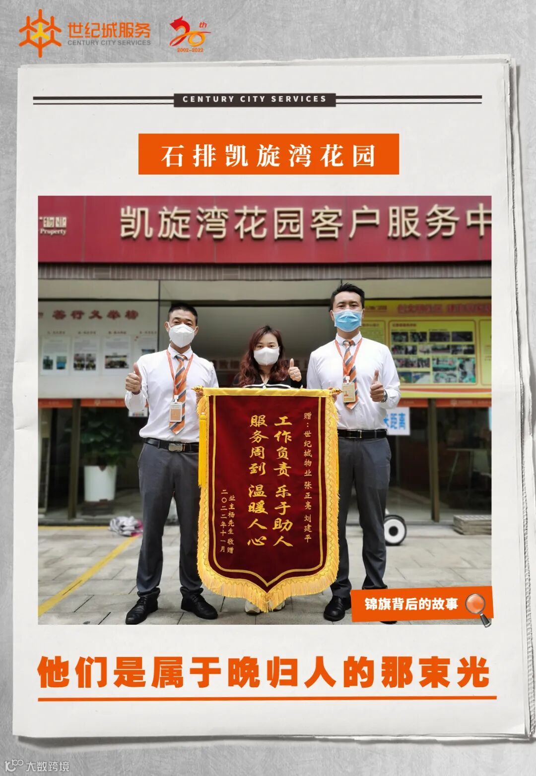 11月21日下午17:30分,石排凯旋湾花园服务处收到29栋301业主送来一面写有“尽职尽责情系业主,热心服务暖至人心”的锦旗,感谢客服部何浩同志工作认真负责、解业主所急的贴心服务。