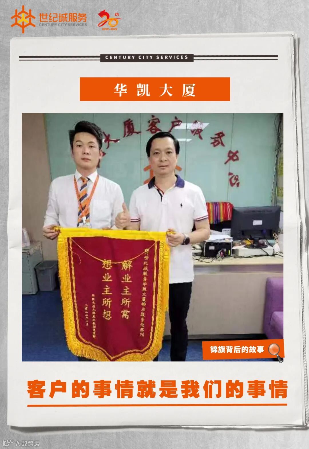 华凯大厦9楼从今年4月退租后,一直空置2个月,张总找到物业服务处希望能够多帮忙宣传,带一些客户看房。项目负责人苏闯知晓情况后,立即利用身边的中介朋友与自己的资源帮助宣传。