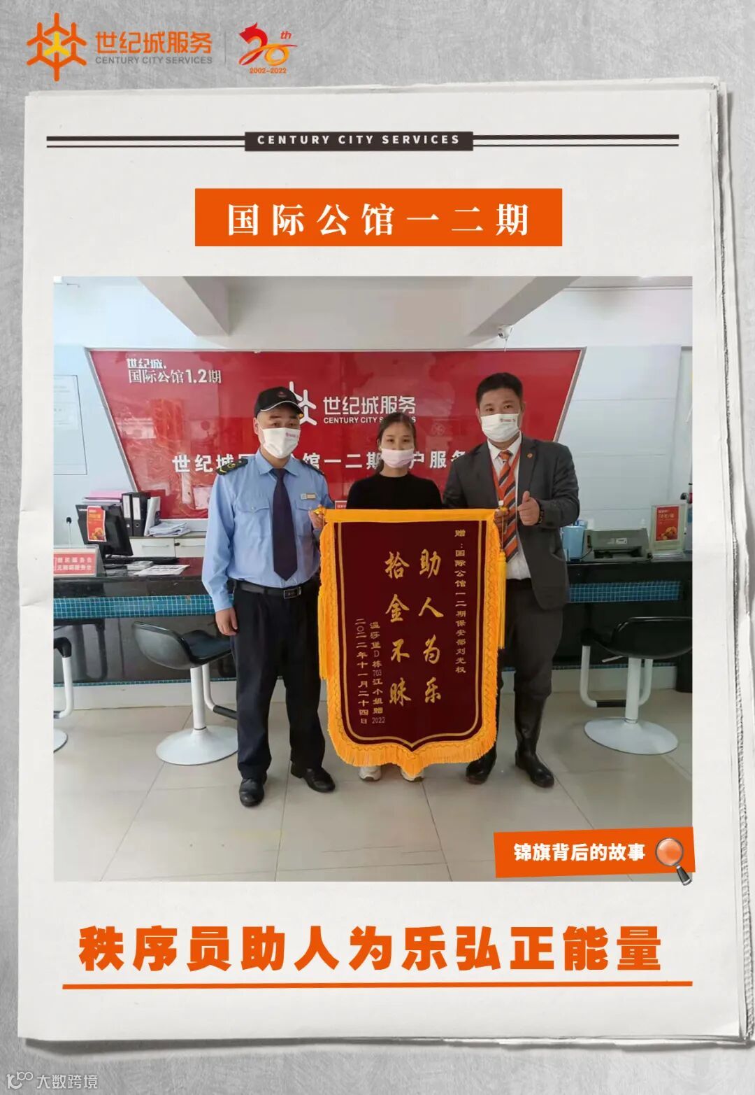 11月24日下午16:15分,国际公馆一二期服务处收到温莎堡D栋703业主江小姐送来一面写着“助人为乐,拾金不昧”的锦旗,感谢秩序部同事刘光权同志拾金不昧的精神!