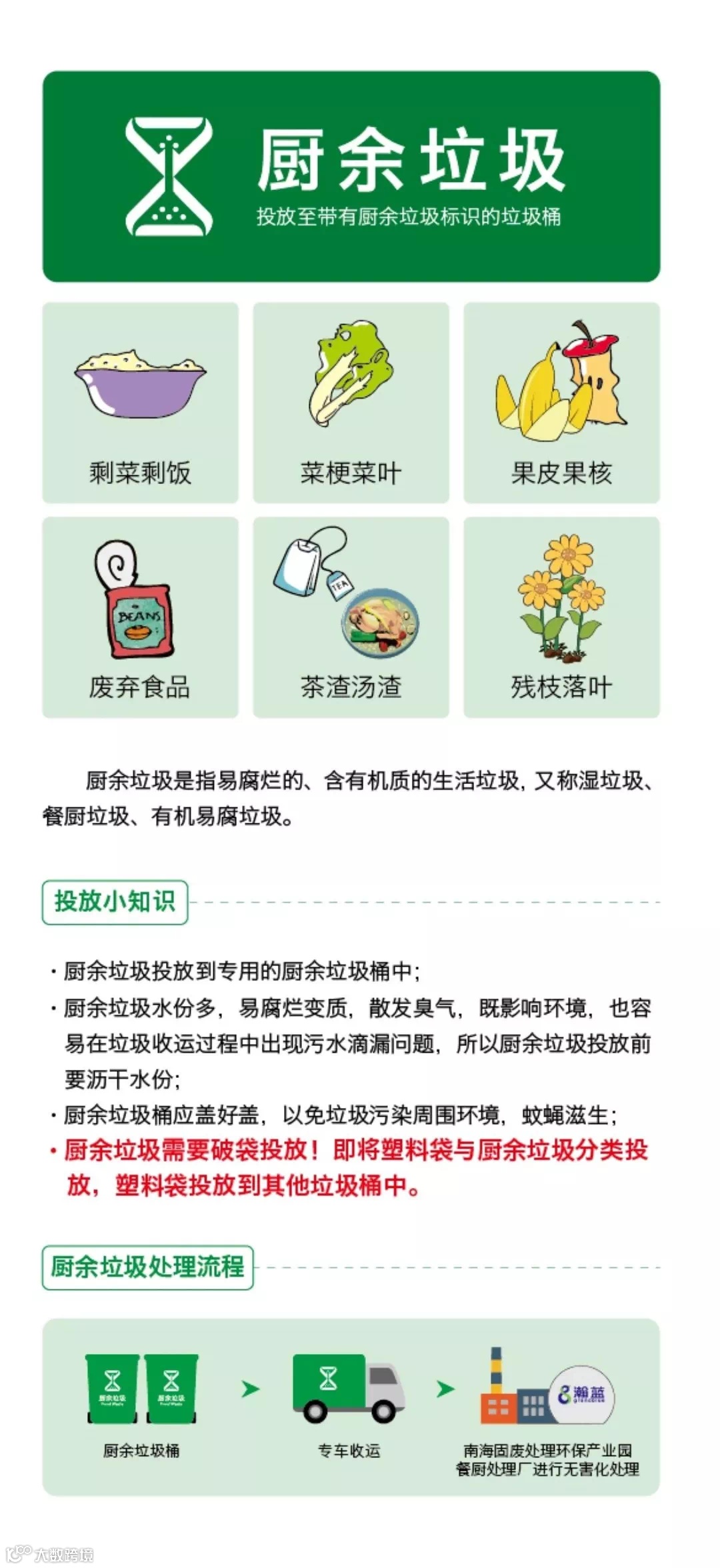 注意:家庭厨余垃圾、餐厨垃圾、废弃食用油脂和生鲜垃圾,应投放至不同的收集容器或投放点。投放时沥干水分,收集到专用垃圾袋中。