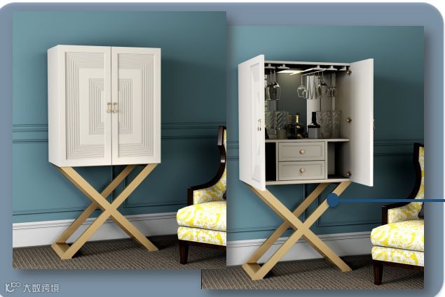 柜体门板采用铣线的工艺手法,增强产品立体度,金属底座采用X型的结构形式,现代时尚,在满足功能需求的同时又增强观赏性。