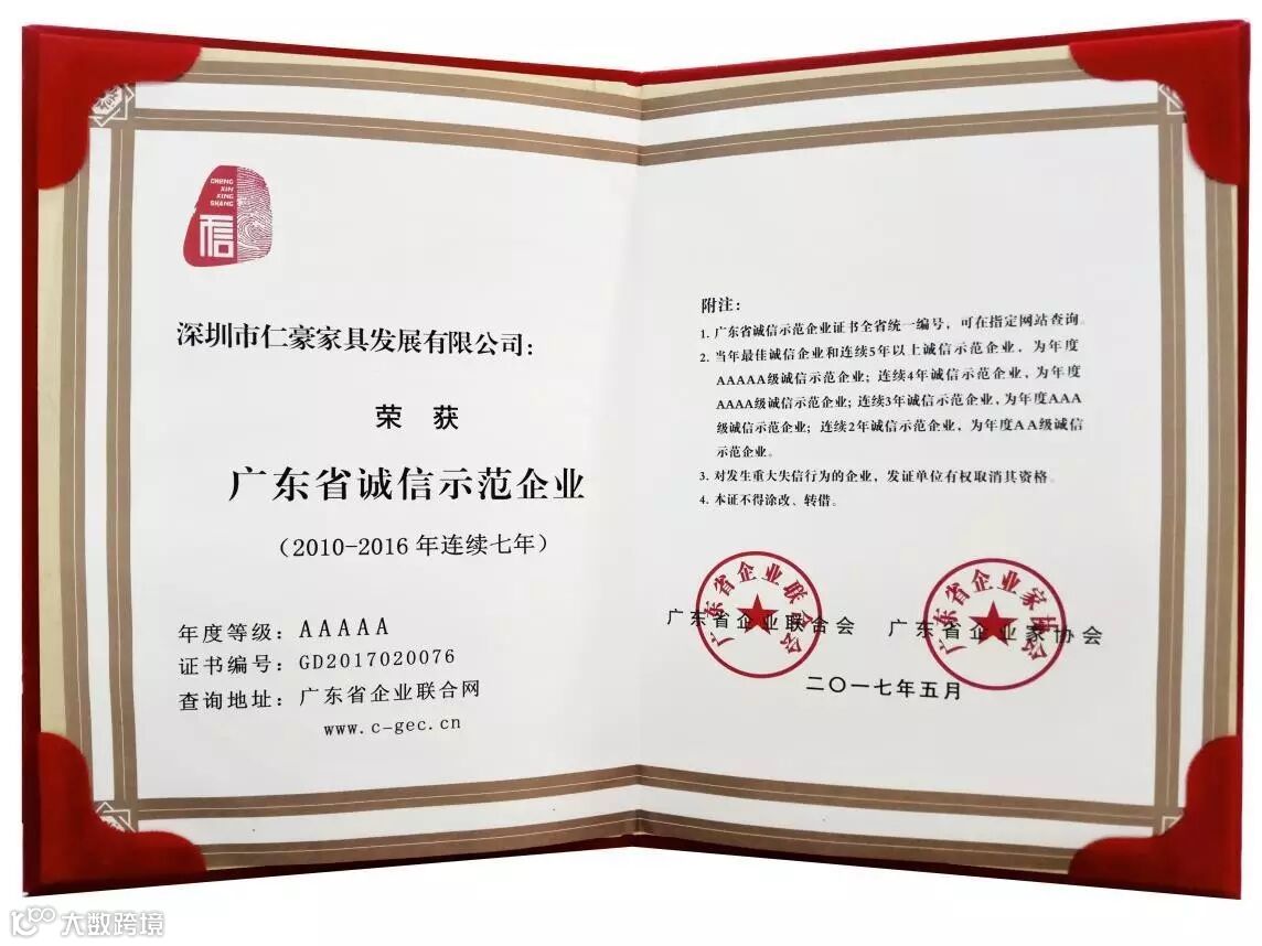 近日,仁豪集团更是凭借着自身不俗的产品品质,再度获得“广东省诚信示范企业”AAAAA级表彰。