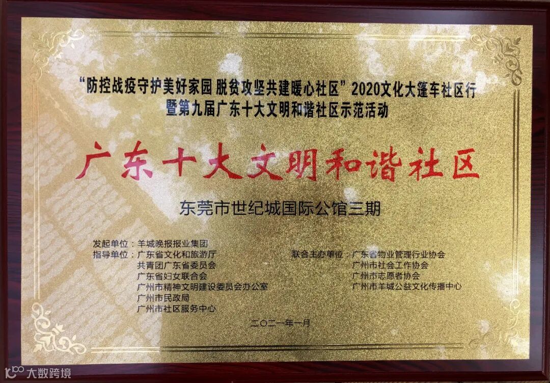 2020年,公司参与由广东省物业管理行业协会主办,广东省文化和旅游厅指导的以“防控战疫守护美好家园,脱贫攻坚共建暖心社区”为主题的2020文化大篷车社区行暨第九届广东十大文明和谐社区示范活动。2021年1月,广东世纪城物业服务有限公司被授予“优秀组织”荣誉称号;世纪城国际公馆三期被授予“广东十大文明和谐社区”荣誉称号。