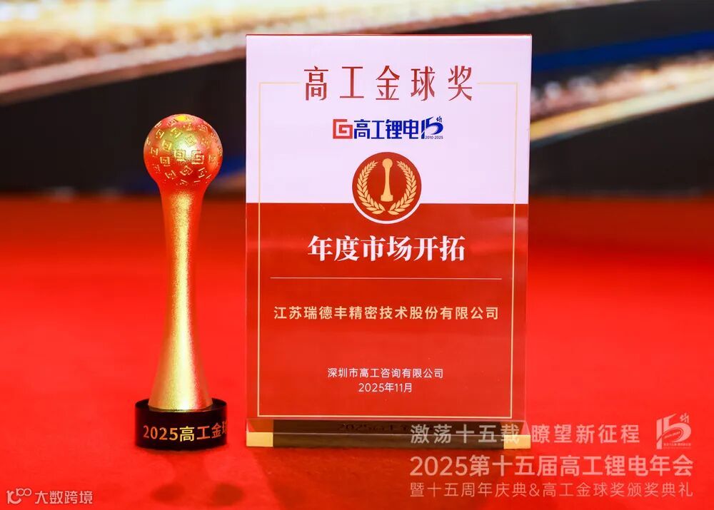 2025年11月20日,第十五届高工锂电年会暨十五周年庆典&高工金球奖颁奖典礼在深圳隆重举行,瑞德丰成功摘得“2025高工金球奖——年度市场开拓”奖。该奖项由高工锂电发起、高工产业研究院(GGII)独立调研评选,是评审委员会对其在市场突破、全球供应链协同及技术驱动的拓展模式的认可。