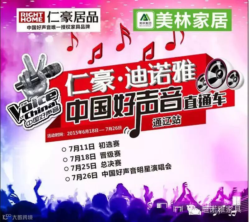 即日起,到2015年7月11日初赛之前,均可前往通辽美林家居购物中心,找到仁豪·迪诺雅相关负责人提交报名资料。无需缴纳任何费用,性别年龄完全不限!我们要的只有声音,只有声音,只有声音!!!