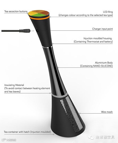 为了让爱喝茶的用户随之随地喝到好茶,Uttara Ghodke设计了这个便携式沏茶器。这是一个造型非常时尚,优雅的设计。它可以同时保存四种茶叶,而且拥有加热和虑茶的功能。用户想要喝茶的时候,只需要选择要想喝的茶叶,按下,然后放在水杯中,打开加热开关,不久,就可以得到一杯刚刚沏好的热茶!用完记得将虑茶网关闭,便于保存也可以再次使用!
