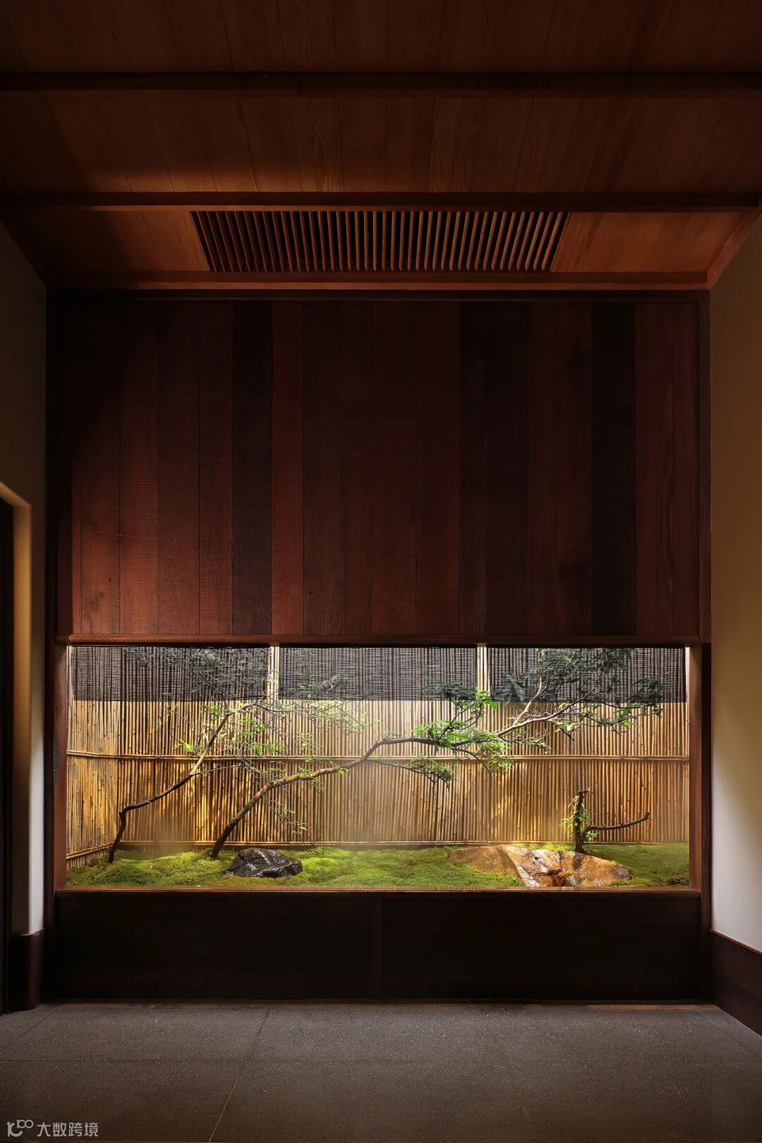 寄于对自然感的再现,主要使用山水,夯土,柚木微弱的反光,安静的氛围被逐步营造,当进入茶室时内心的焦虑或许在这坐下后注视着周边安静的喝一杯茶能够平复。