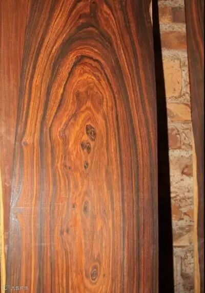 这种木材纹理近似老挝红酸枝,常见黑褐色条纹,且纹理清晰,色泽多偏橘红色,染色后很难分辨。