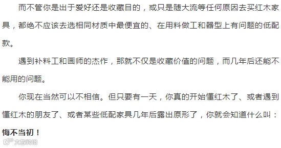 这里先排除真假、掺料、拼补这些低级问题(事实上也并不低级,比如拼补这个问题绝大多数新手是没有概念的,还以为和“拼板”是一样的。更看不明白,否则,那些十几万二十几万的大红酸枝沙发就不会那么畅销了),只讲“真货”。