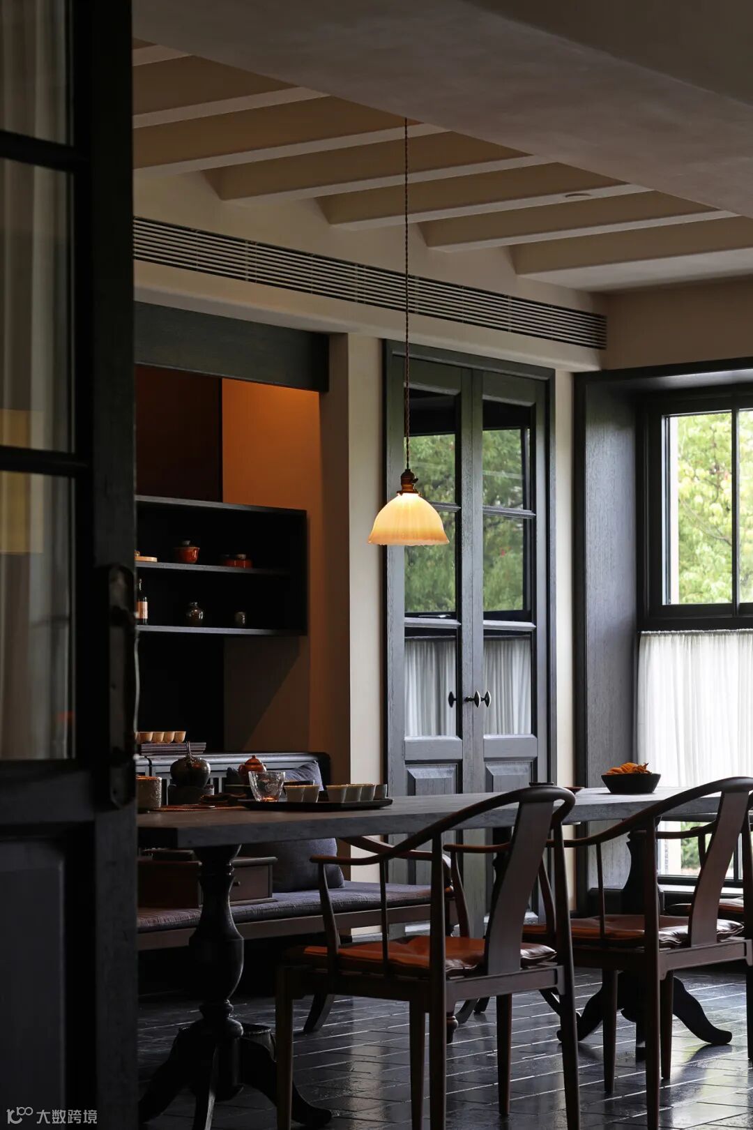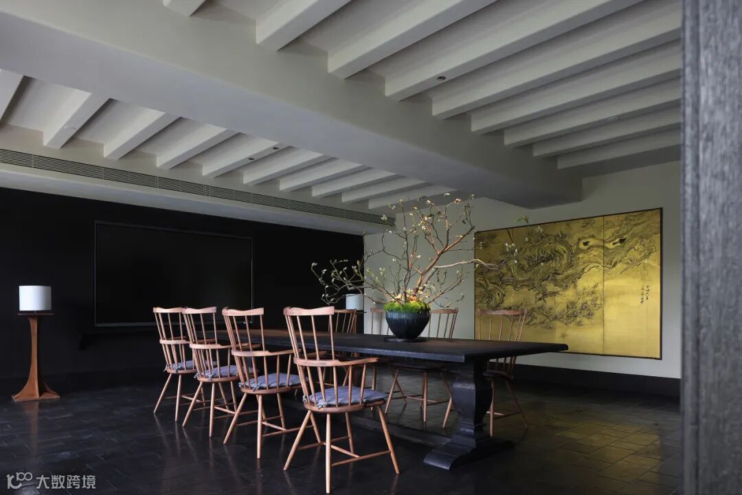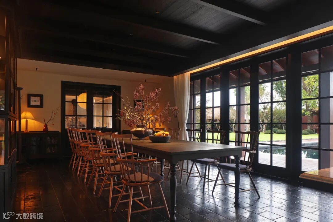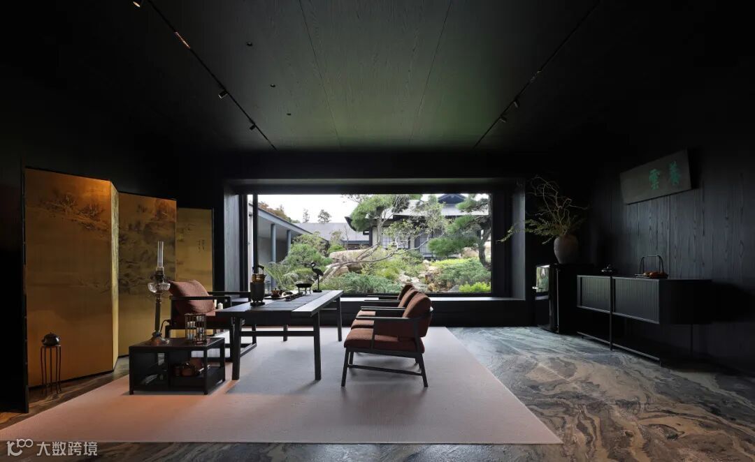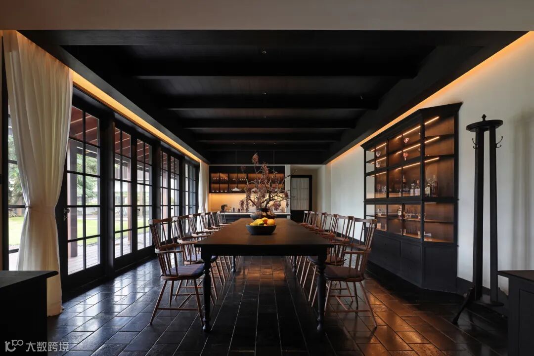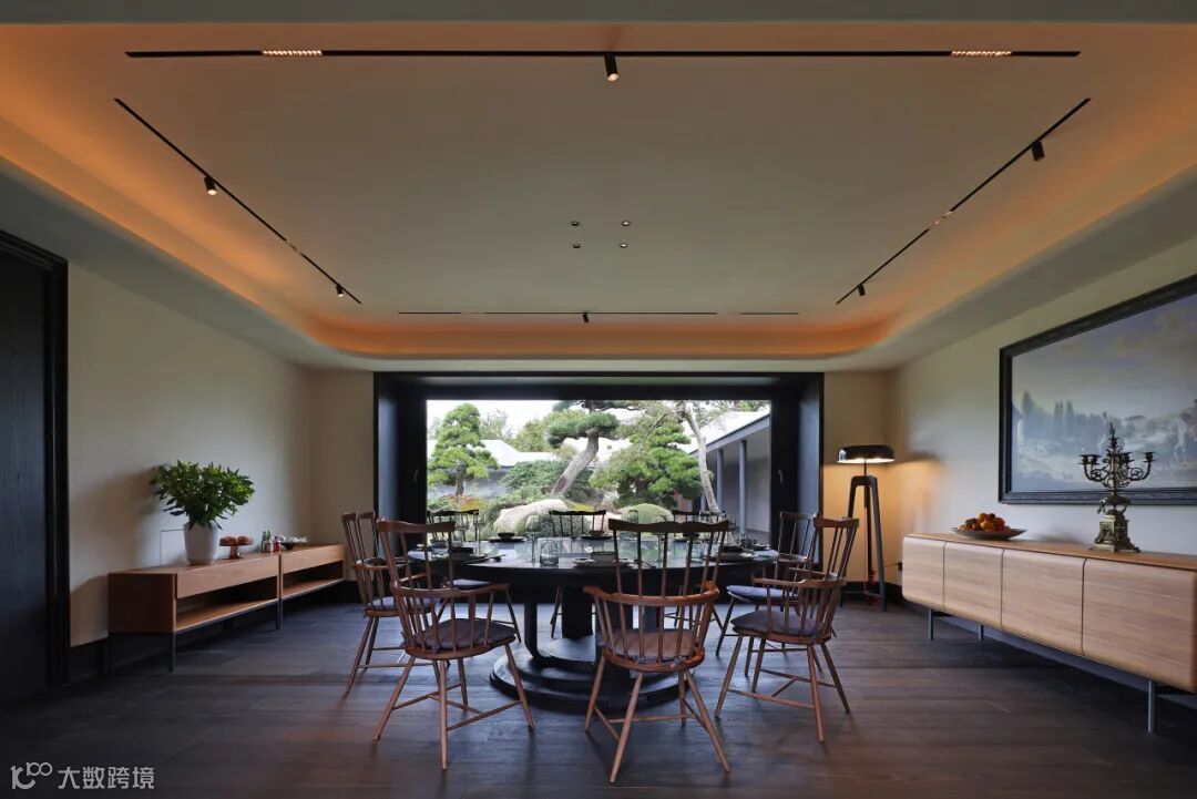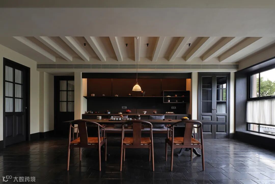 餐厅里充满禅意的现代设计与木质家具和黑色地砖相结合,平衡了建筑美与自然美,使材料在互相衬托中展现出状态。