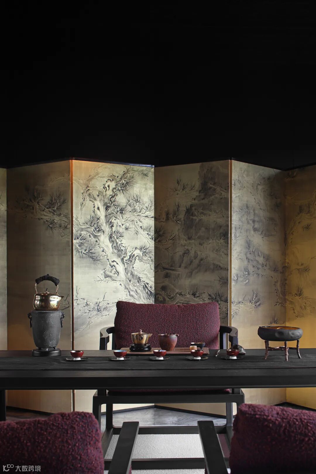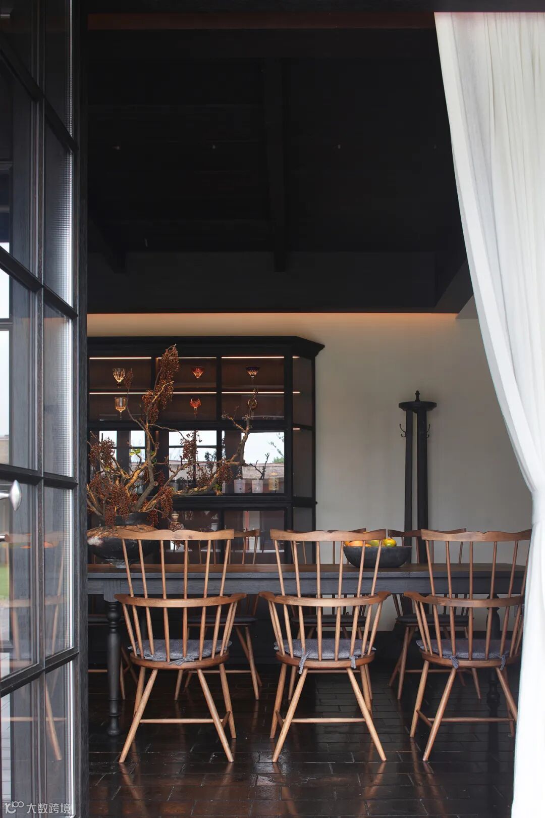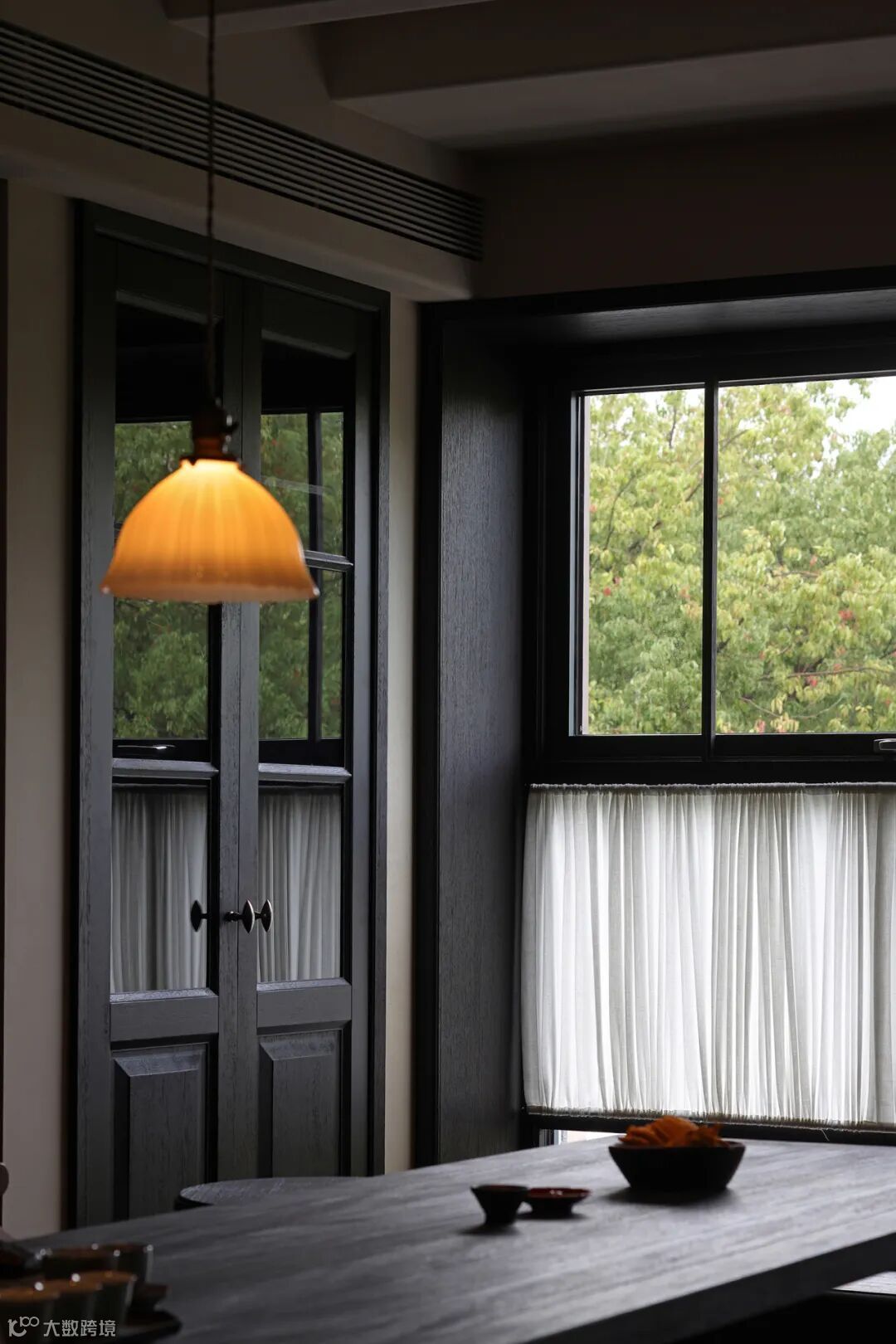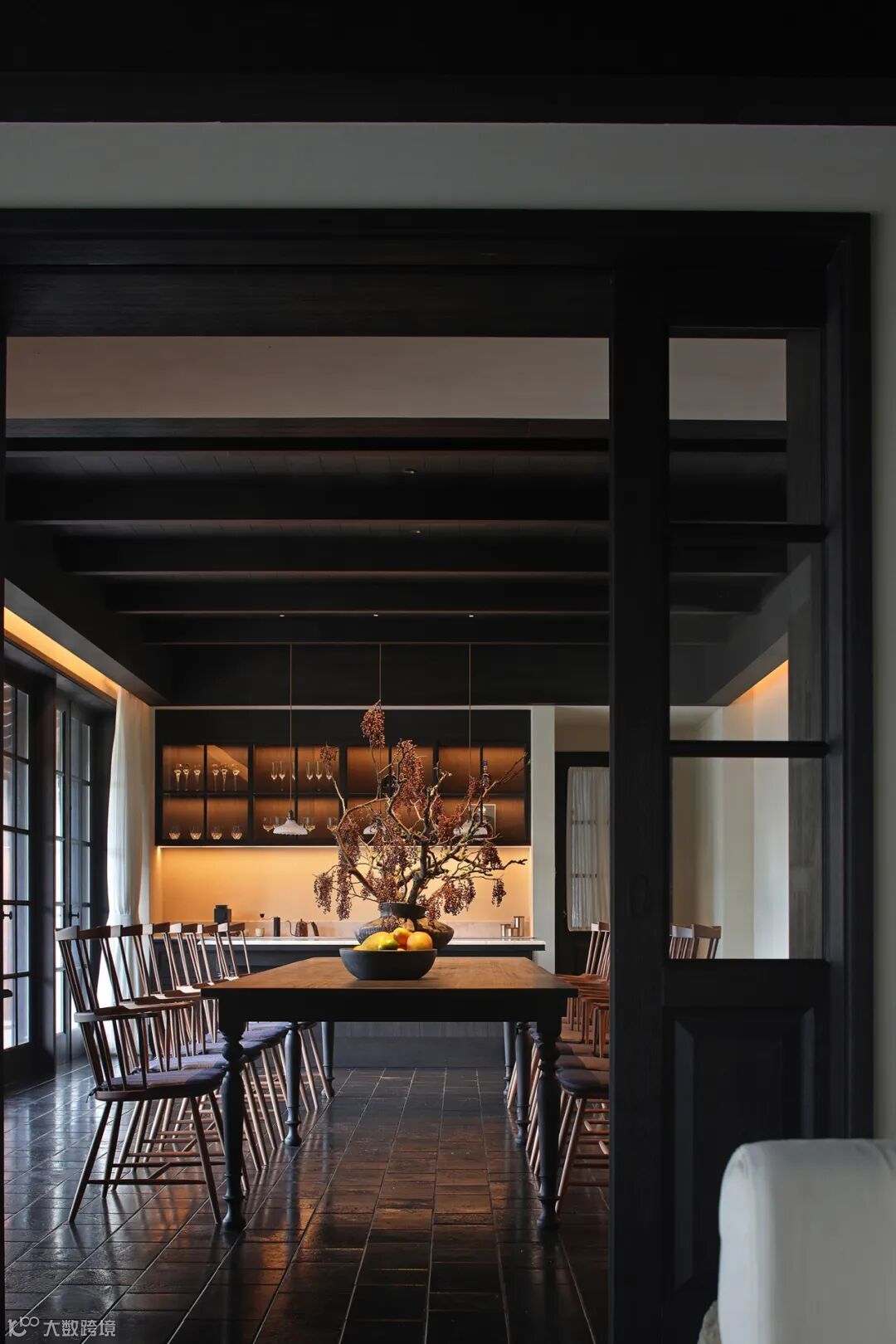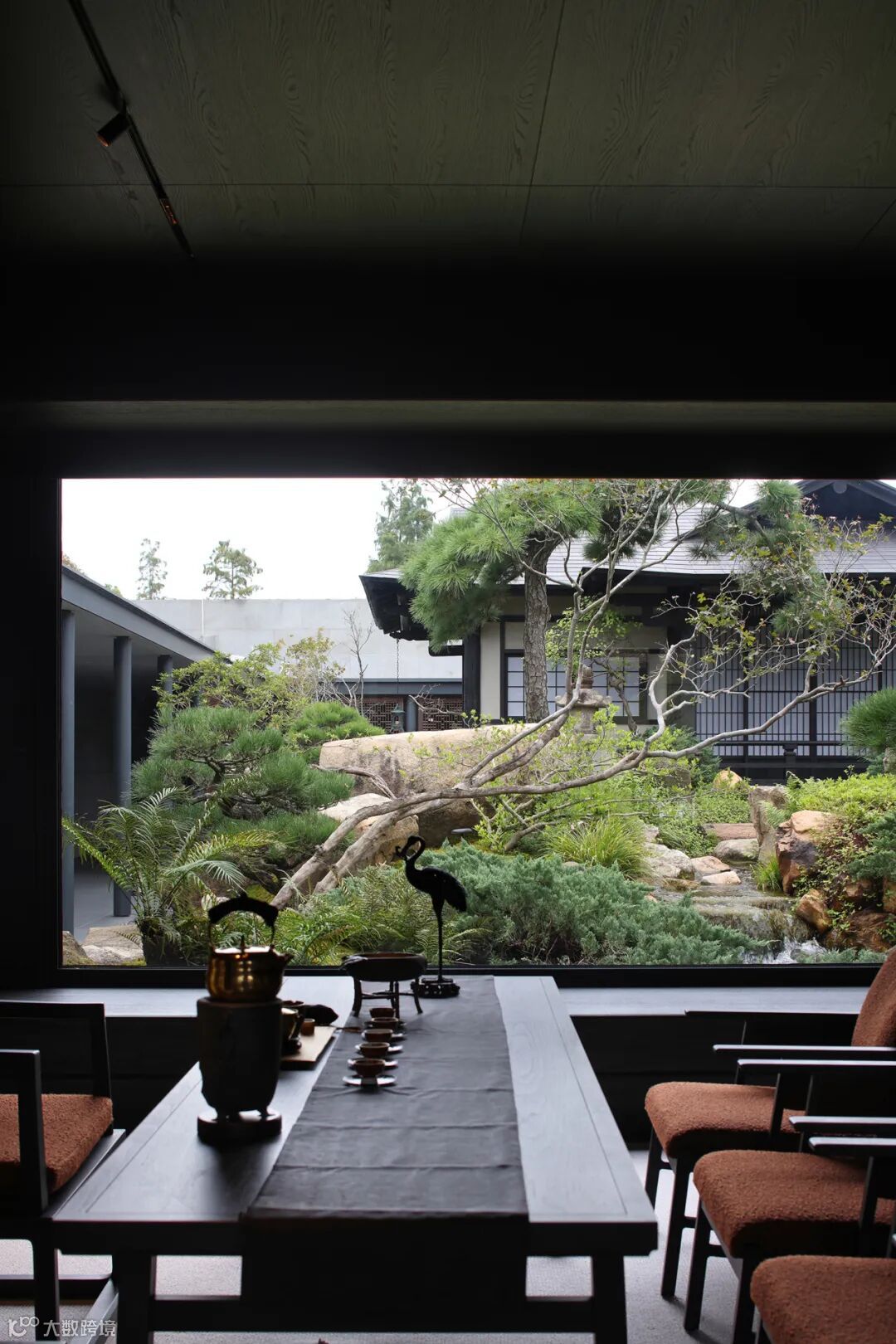 餐厅里充满禅意的现代设计与木质家具和黑色地砖相结合,平衡了建筑美与自然美,使材料在互相衬托中展现出状态。