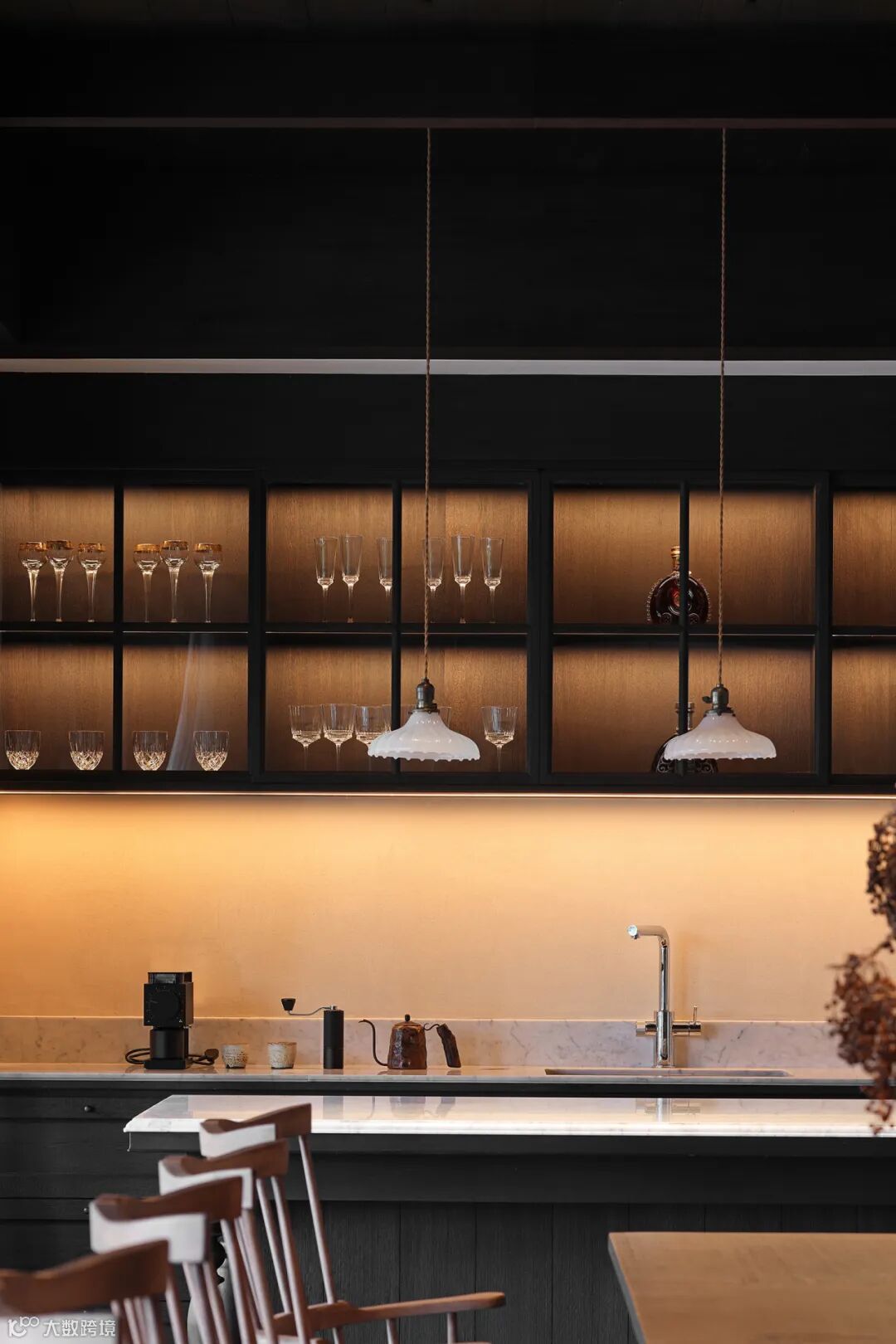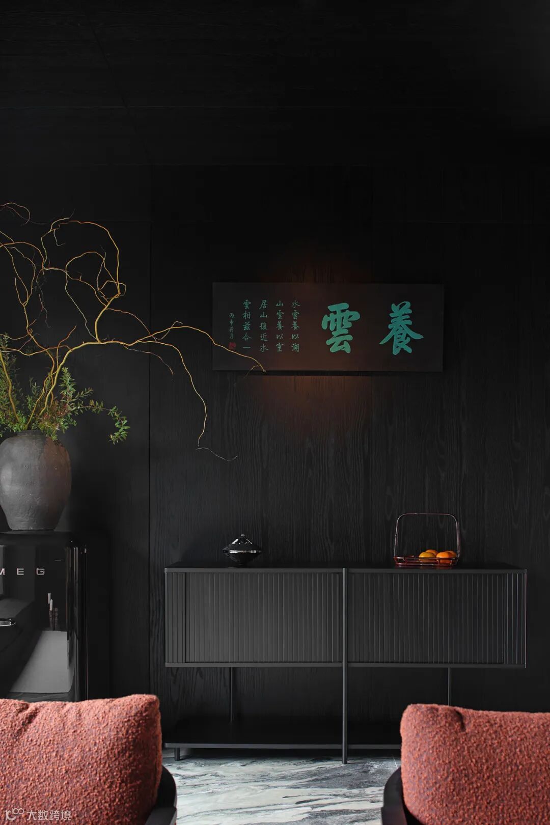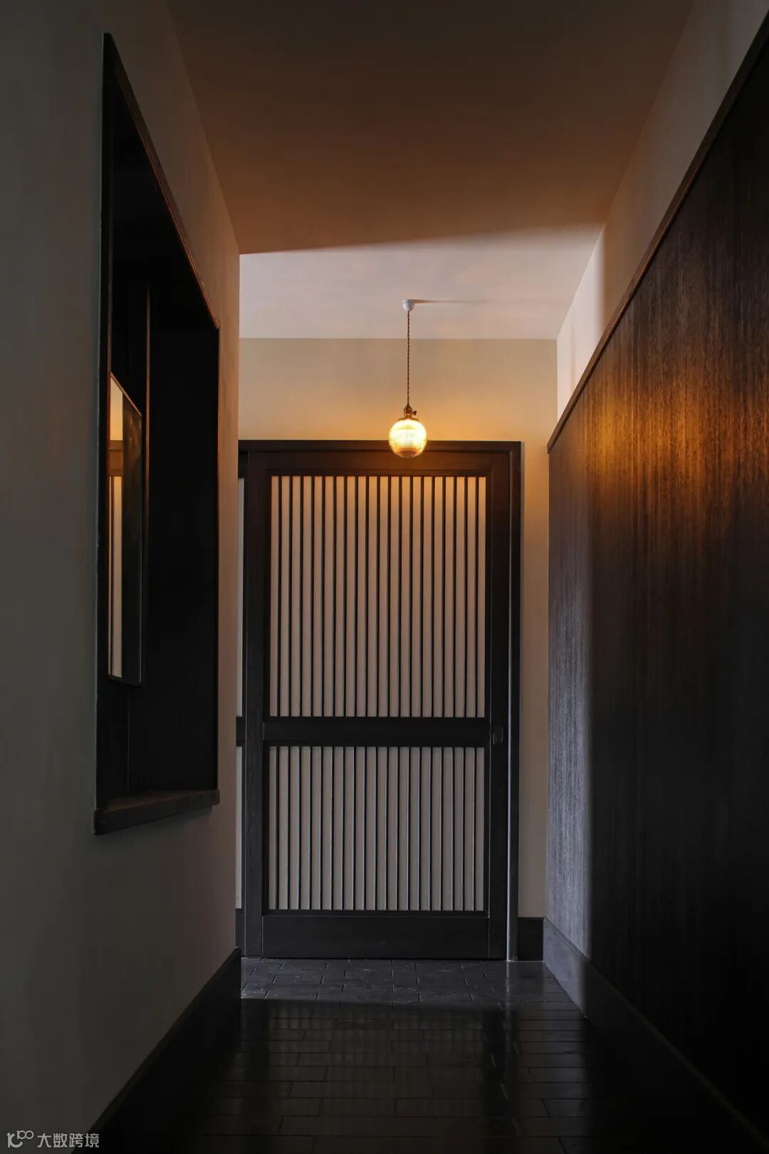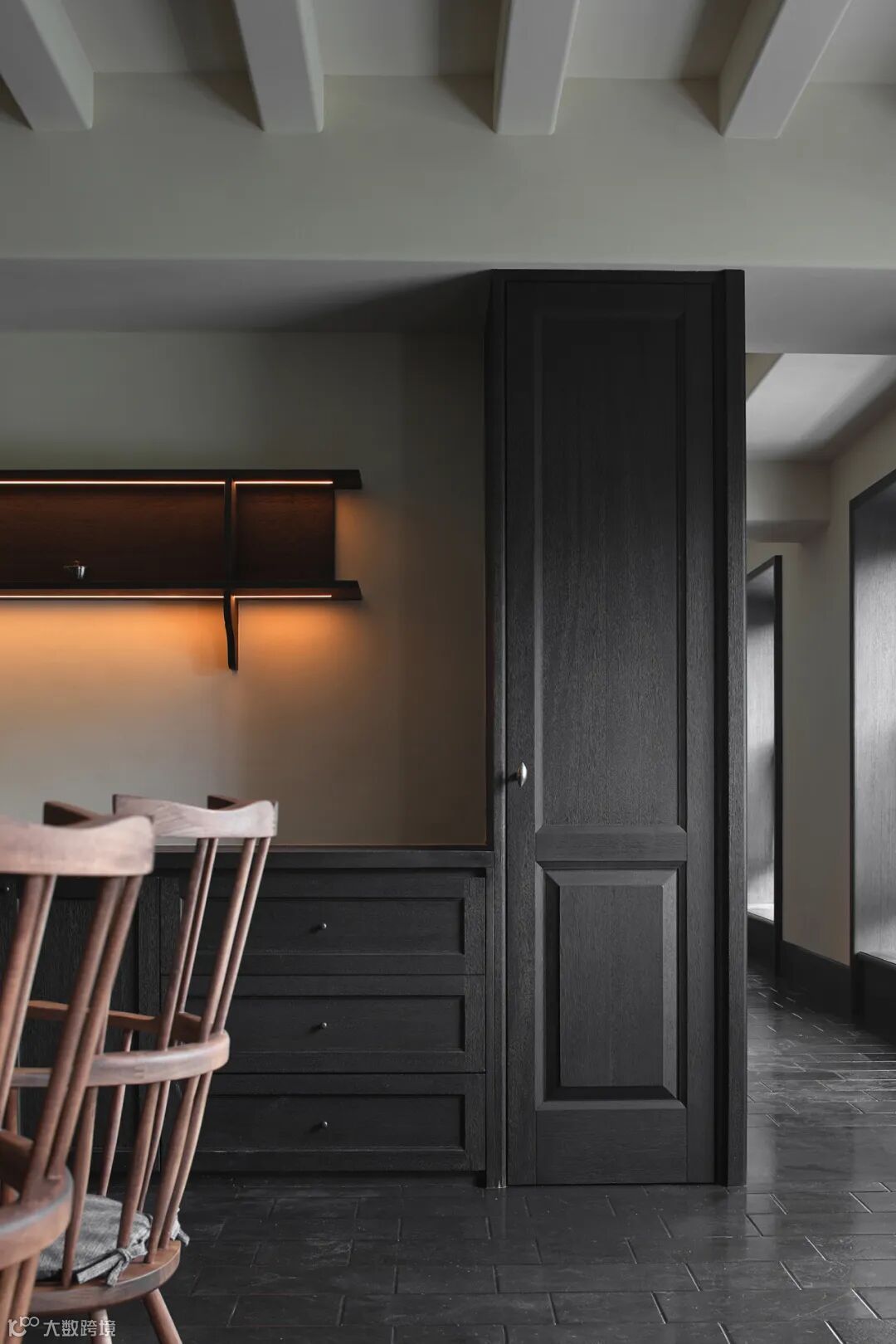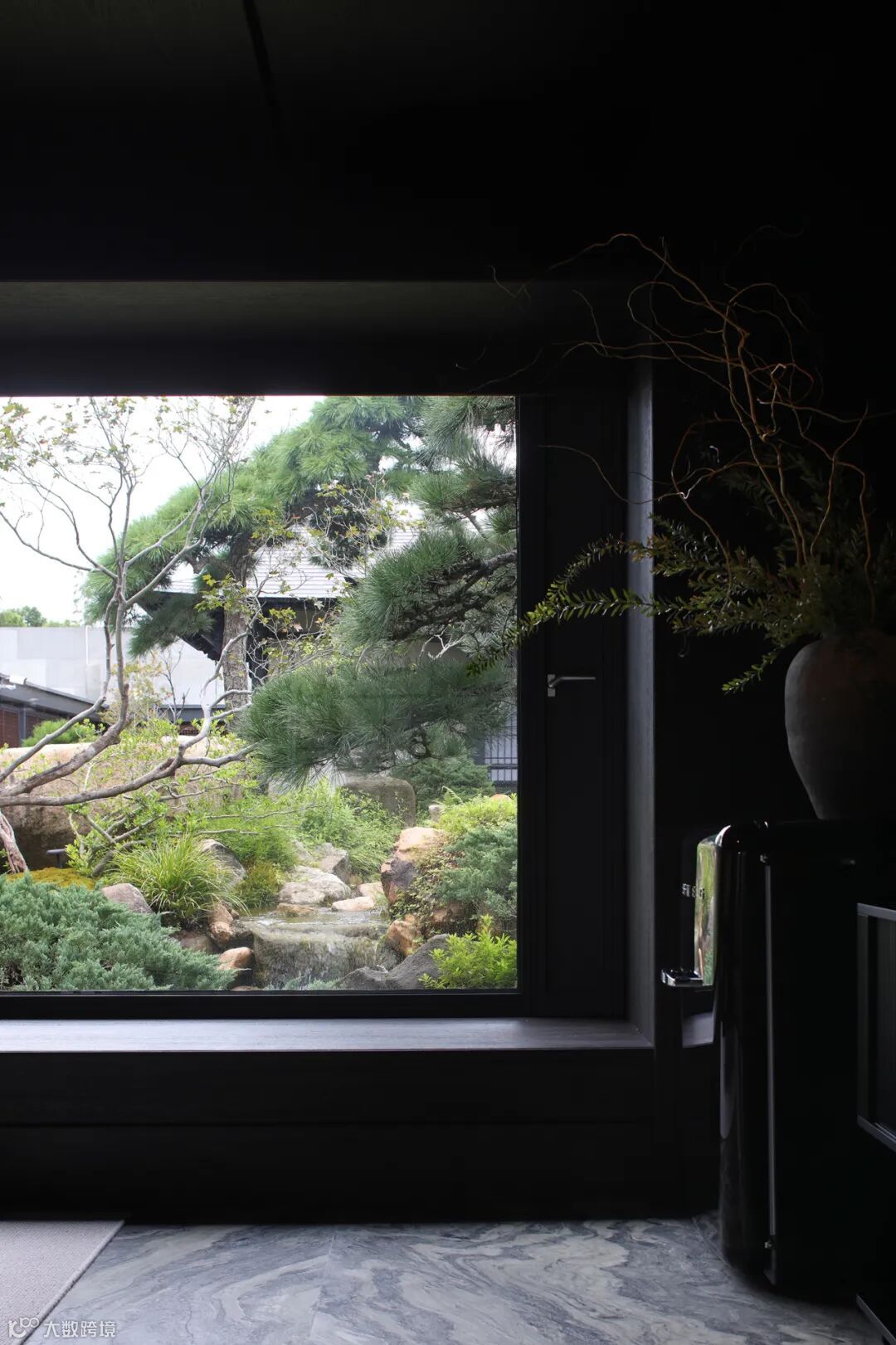 餐厅里充满禅意的现代设计与木质家具和黑色地砖相结合,平衡了建筑美与自然美,使材料在互相衬托中展现出状态。