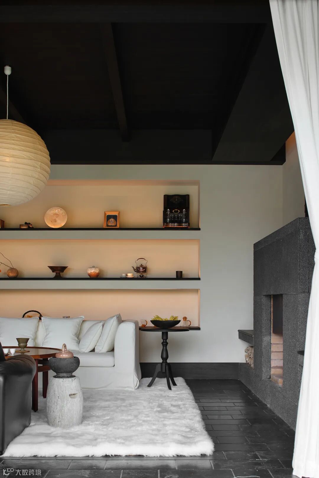 粗麻与编制工艺的织物搭配中古饰品,将自由写意的心境带入室内。内与外、深与浅、质朴与精巧,这一重重的对比,映衬出空间的静谧之境。