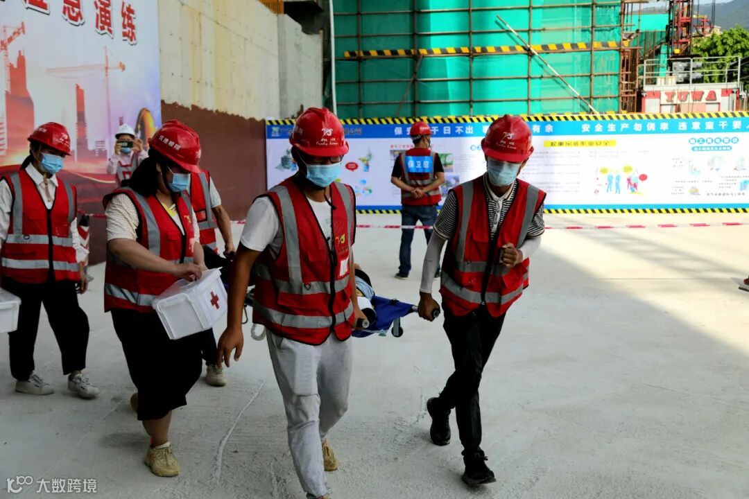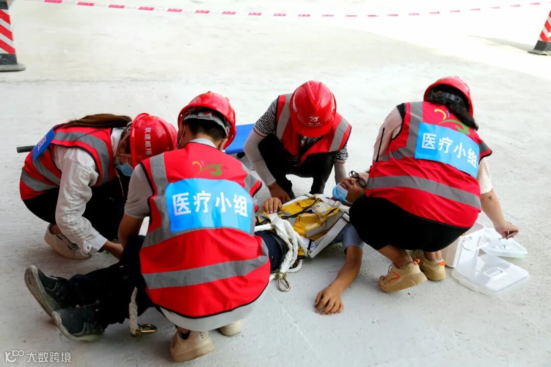 此次演练是以全国第19个“安全生产月”活动为背景,模拟项目一名“工人”安全带使用不规范,不慎从高空坠落,项目部负责人接到现场人员的事故报告后,迅速启动救援应急预案并立即通知相关救援单位,现场应急救援组、保卫组、医疗组、资金物资保障组、调查组各司其职,展开抢救联动工作,对受伤“工人”实施现场临时救治并在确认无生命危险后,将“工人”送往医院治疗。