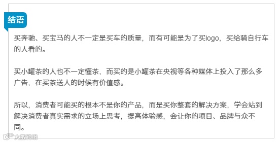 消费者可能买的根本不是你的产品,而是买你整套的解决方案,比如买名车解决的是虚荣的问题、买贵茶解决的是送礼选礼物的问题,学会站到解决消费者真实需求的立场上思考,提高体验感,会让你的项目、品牌与众不同。