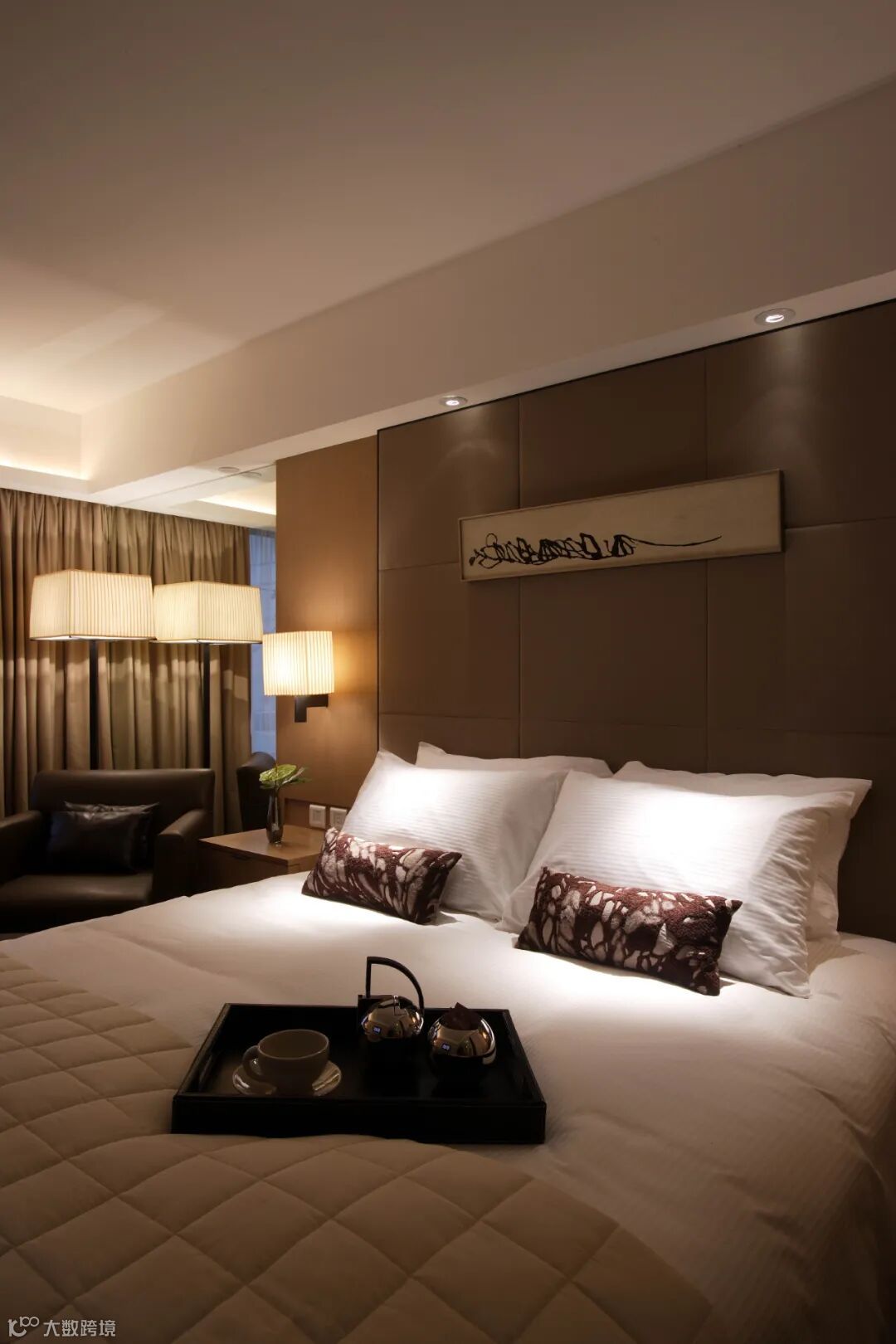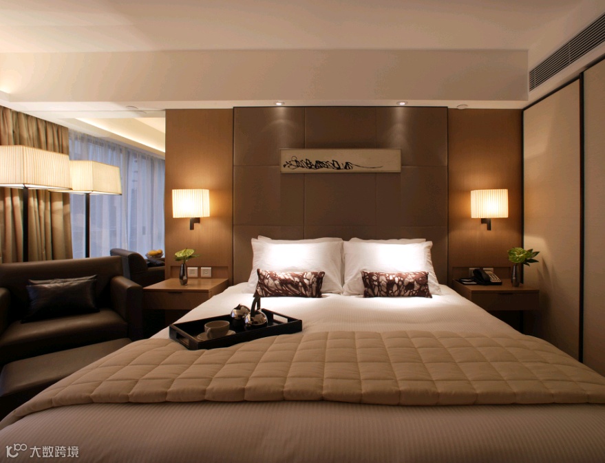 客房采用无主灯设计,灯带和壁灯组合搞定室内照明设计。整个房间色调是偏暖的大地色系搭配组合。卡其色、奶油色、咖啡色等相关色。