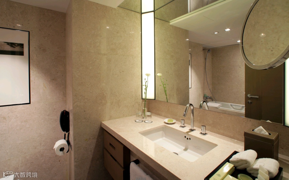 为了让空间整齐划一,洗漱间的墙面砖与洗手台台面石材采用的都是一样的颜色纹理。