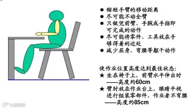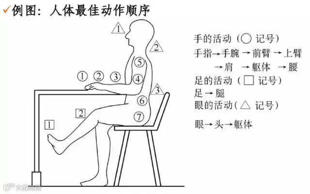 从上述22个基本原则可以看出,动作经济原则的基本思想是充分利用双手和身体其他部位,创造舒适的工作条件,减轻工作人员的疲劳,提高动作的效率。