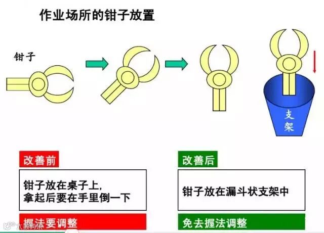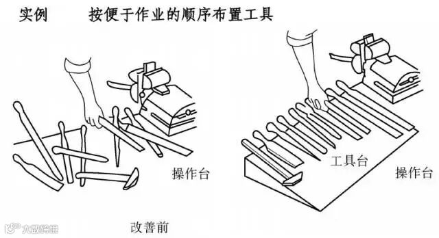 工具、物料按左右为难放置于固定位置,可以帮助操作者的习惯形成,习惯一旦养成,操作者就可以不经考虑思索,就能顺利地以消耗最少的精力来完成其工作。