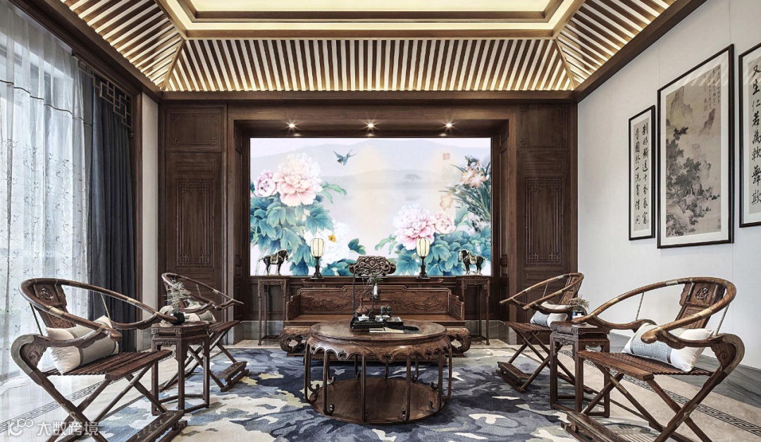 木梁吊顶形成独特的中式天花;主背景墙以深色柚木衬托出“花开富贵”的主题,地面订制的泼墨写意花卉地毯,与侧墙工笔花鸟的挂画有层次的对主题进行延伸、渲染;两两相对的明清圈椅造型简练、做工精细。
