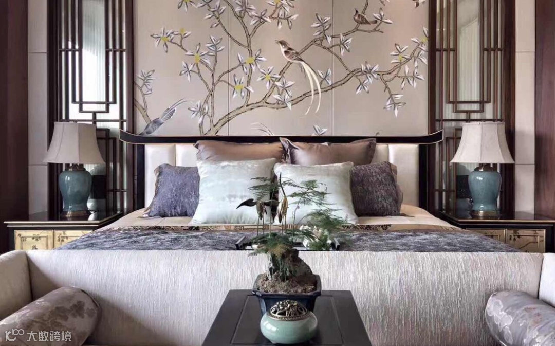 “撷取清风一地香,幽韵清远情飞扬。”中式卧室花鸟背景墙净蕊凝香,一处繁花疏影在时间、空间的流转中洇散着清逸与馨暖,与红木家具相衬,更显红木家具的雅致与古雅