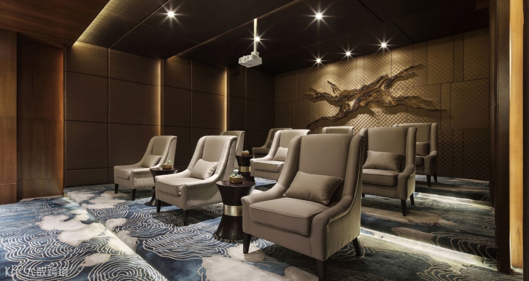 以深色柚木衬托出“花开富贵”的主题,地面订制的泼墨写意花卉地毯,与侧墙工笔花鸟的挂画有层次的对主题进行延伸、渲染;两两相对的明清圈椅造型简练、做工精细。